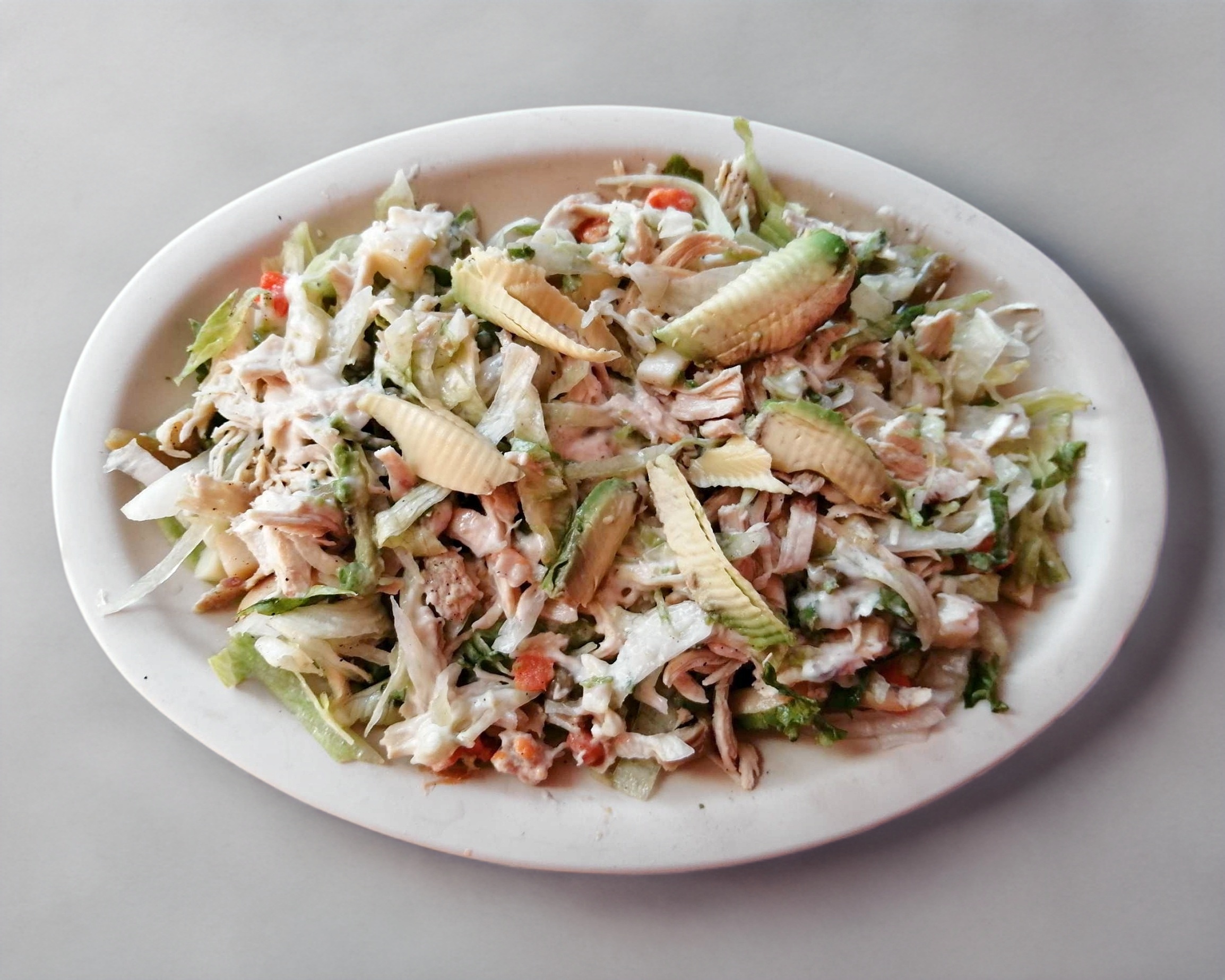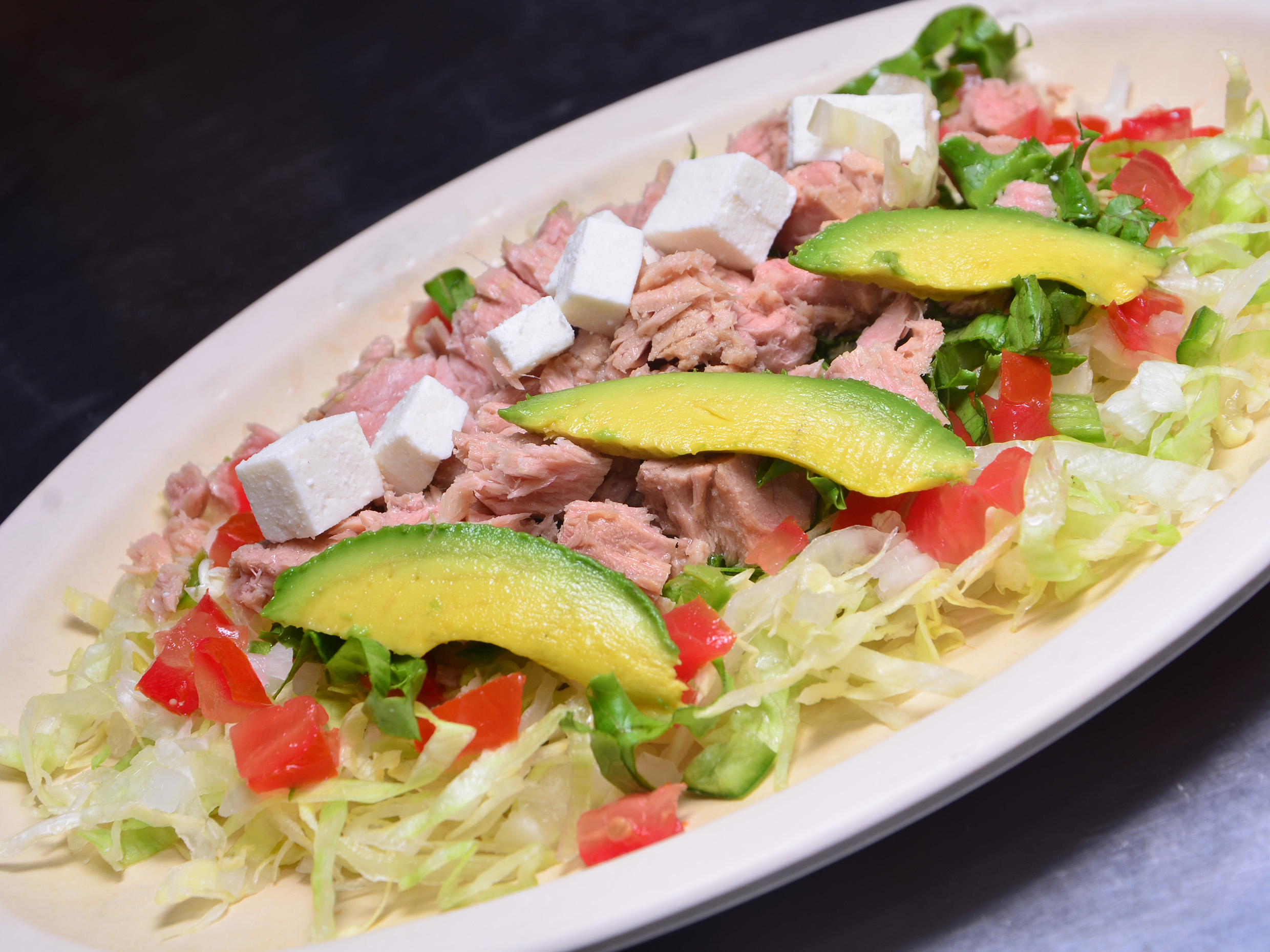 Combinación de lechuga romana e italiana con atún, pico de gallo, queso panela, aguacate, jugo maggi y limón.