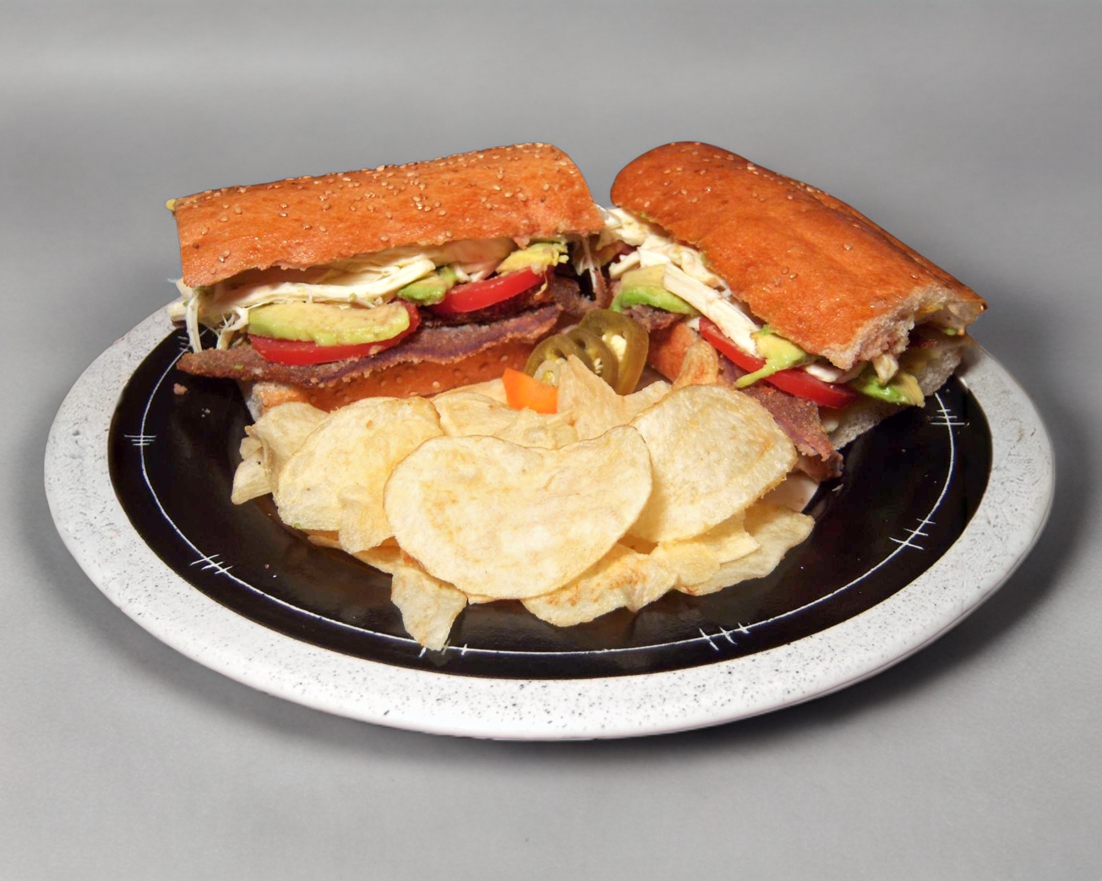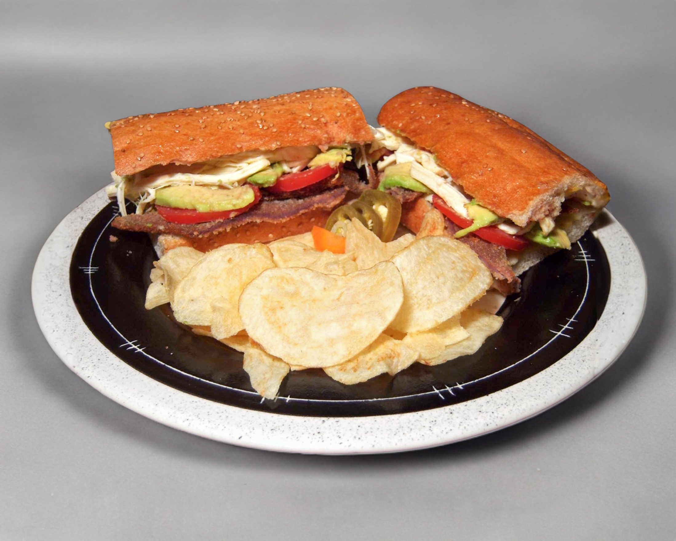 Tiras de pollo, queso, lechuga italiana, germen de alfalfa, pepino, jitomate y aguacate, mayonesa y mostaza.