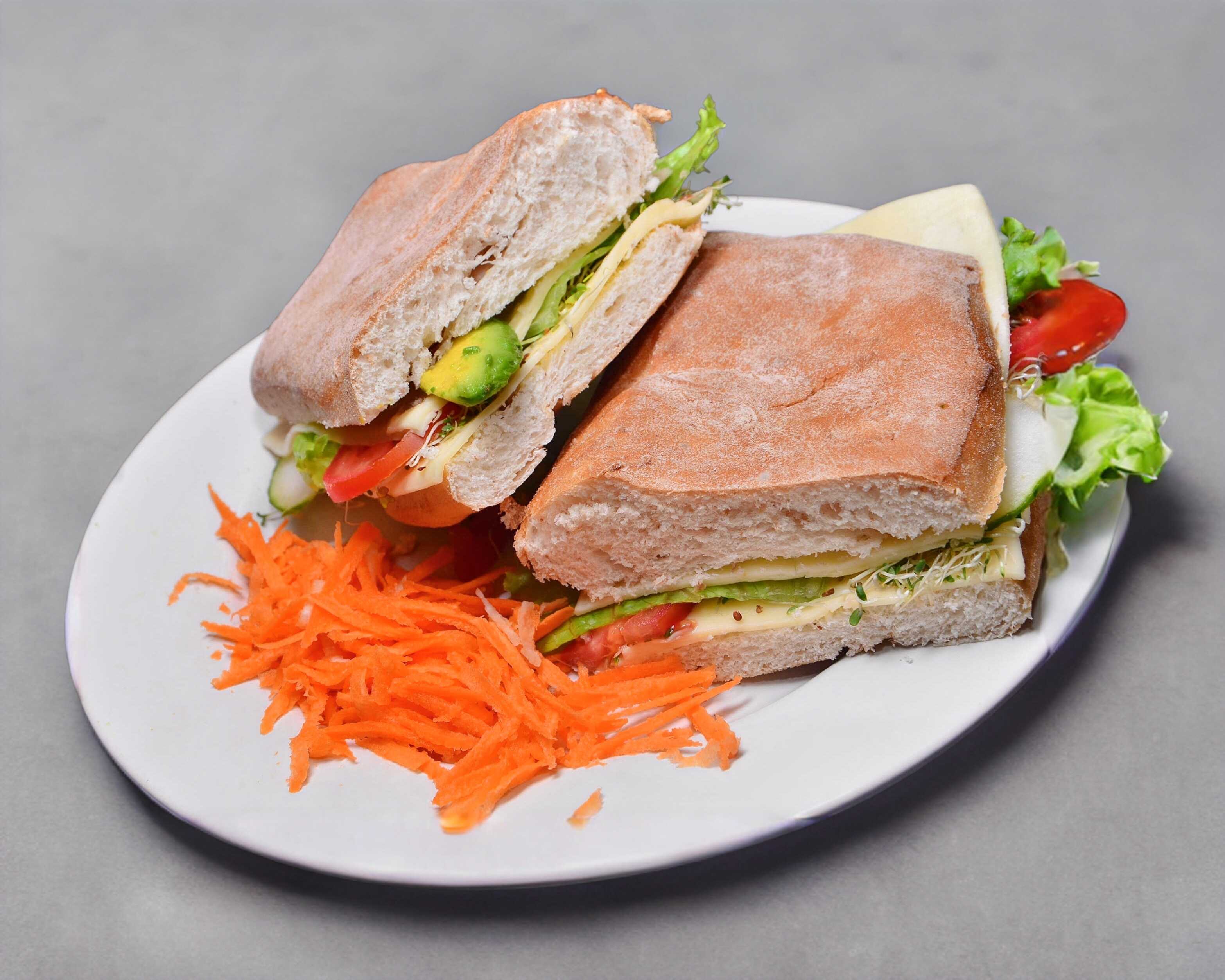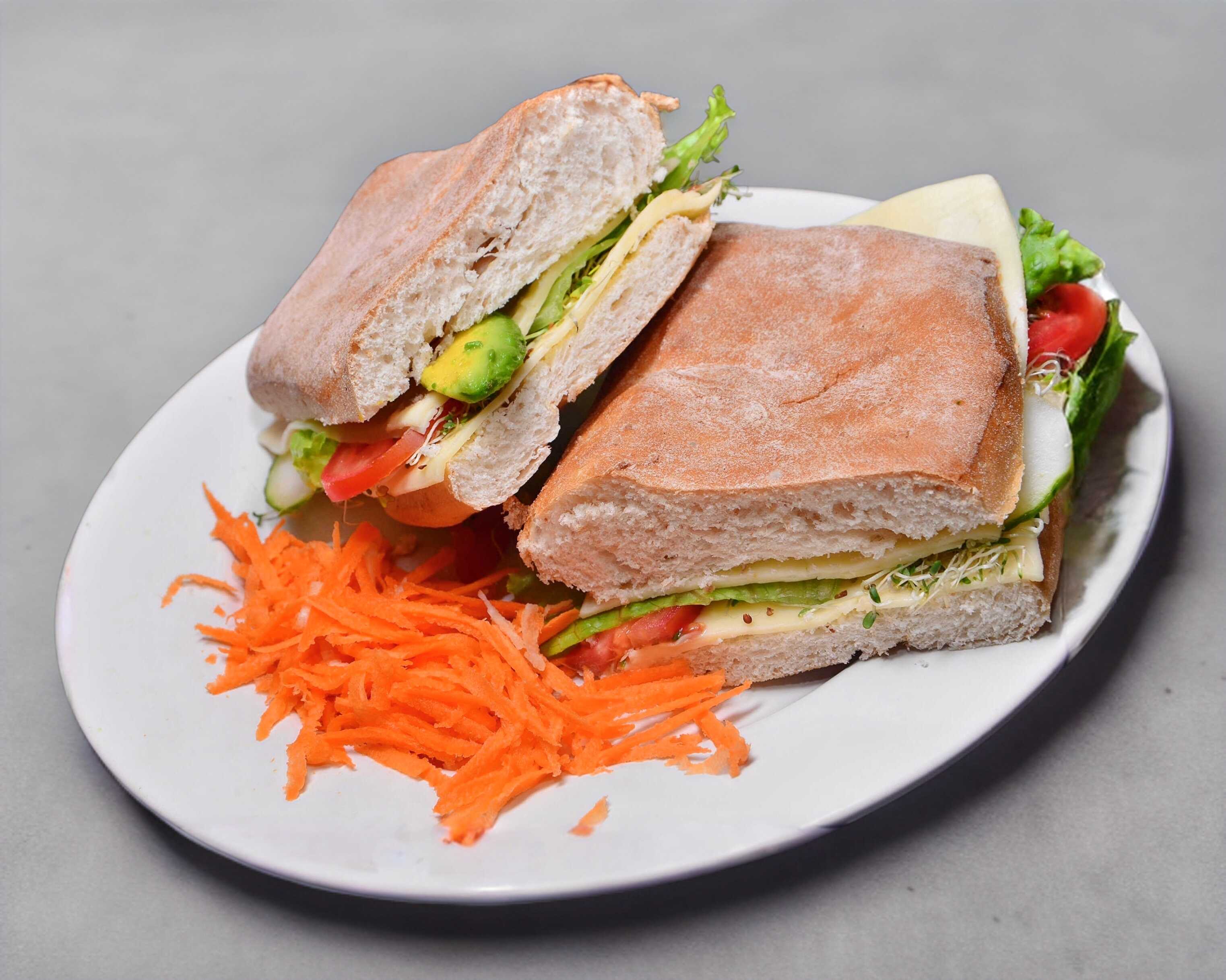 Pan integral especial. Queso, lechuga italiana, germen de alfalfa, pepino, jitomate, aguacate, mayonesa y mostaza. A elegir: queso manchego, queso panela o queso Oaxaca.