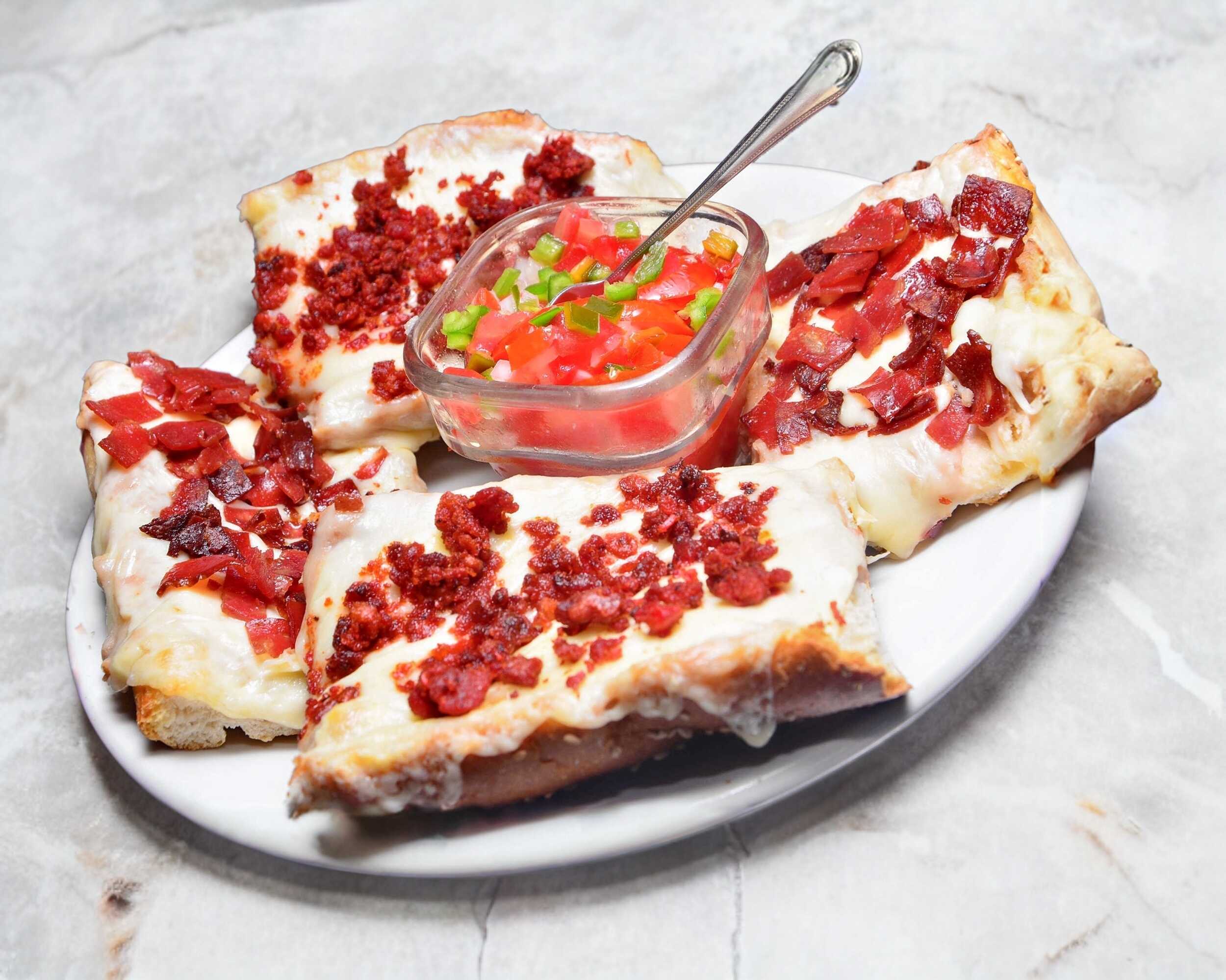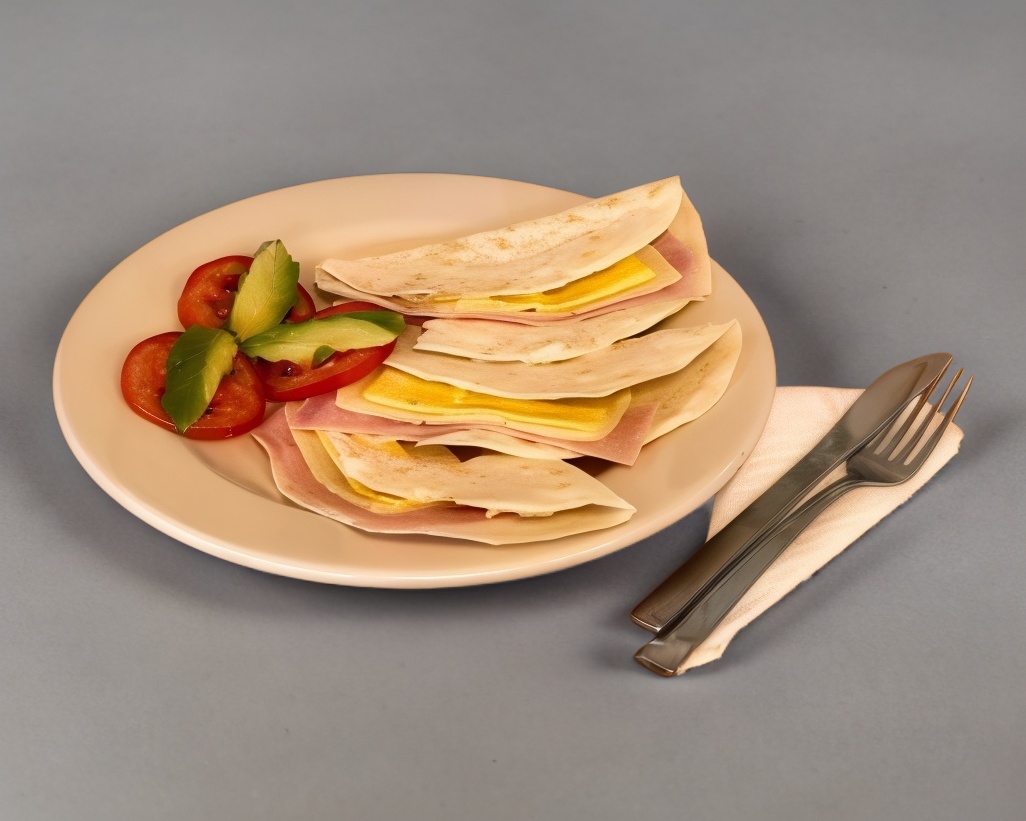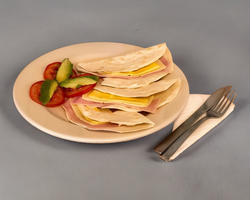 Quesadillas en tortillas de harina con jamón, queso amarillo y manchego con guarnición de jitomate y aguacate.