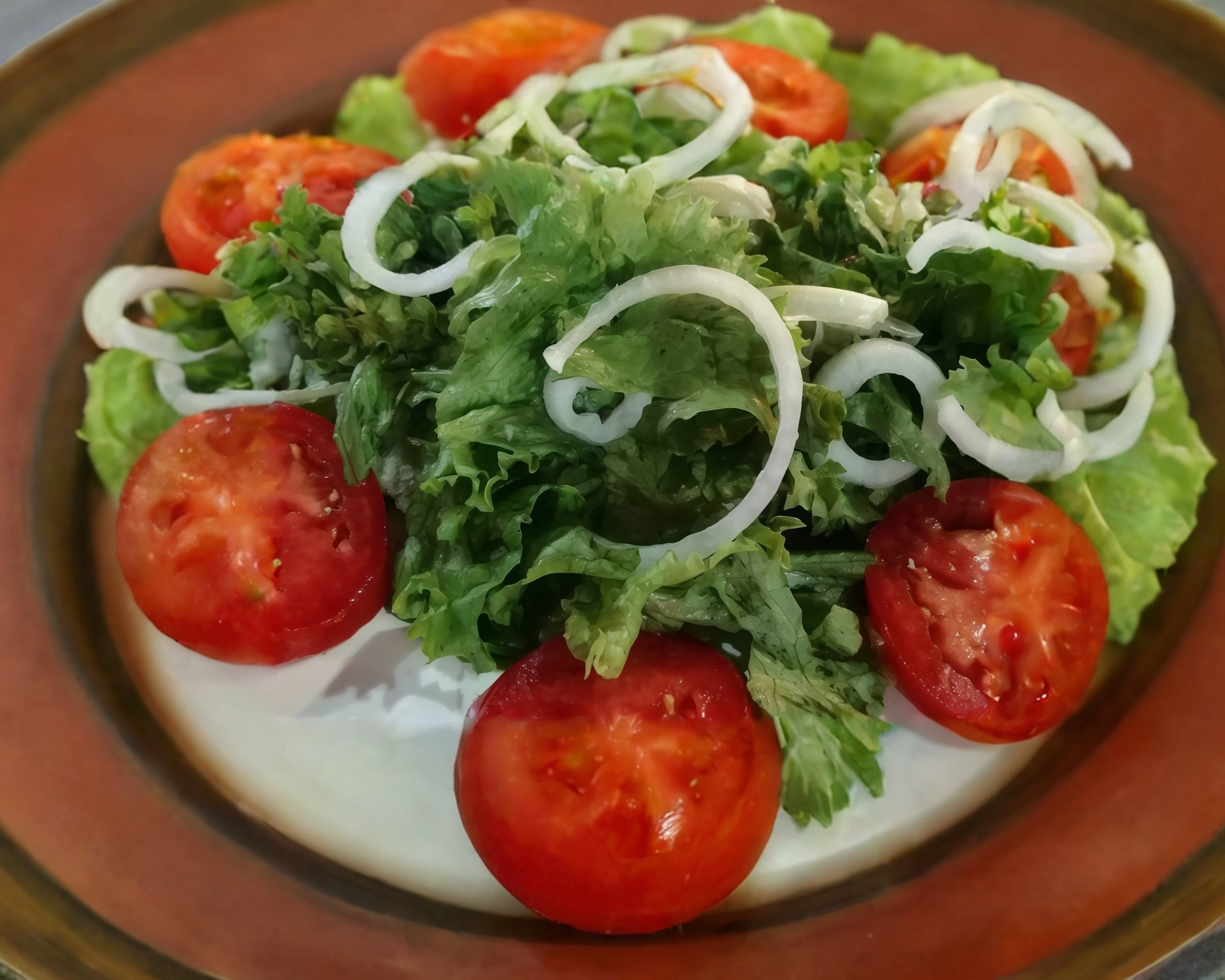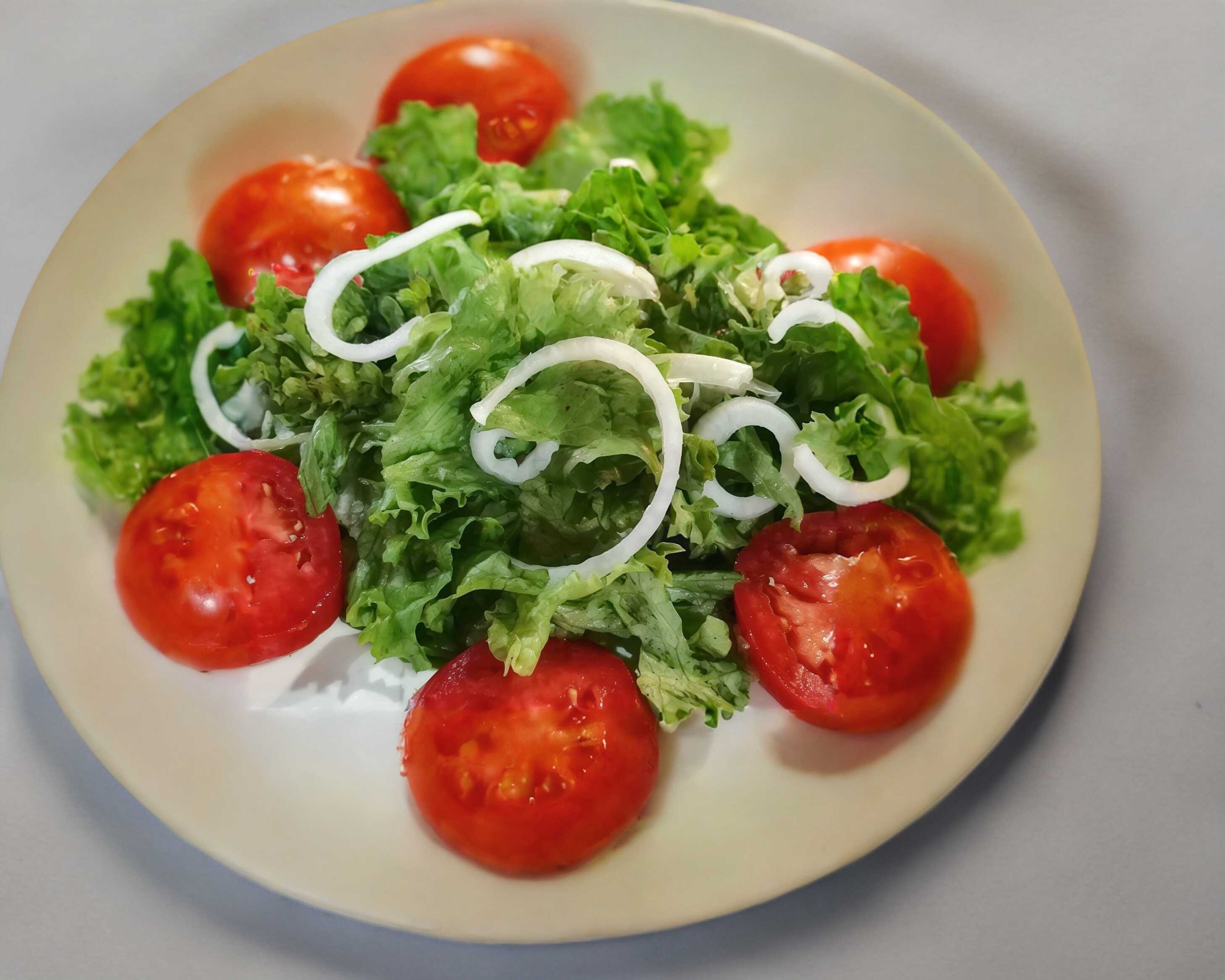 Combinación de lechuga romana e italiana con jitomate, cebolla, aceite de oliva, pimienta, sal y limón.