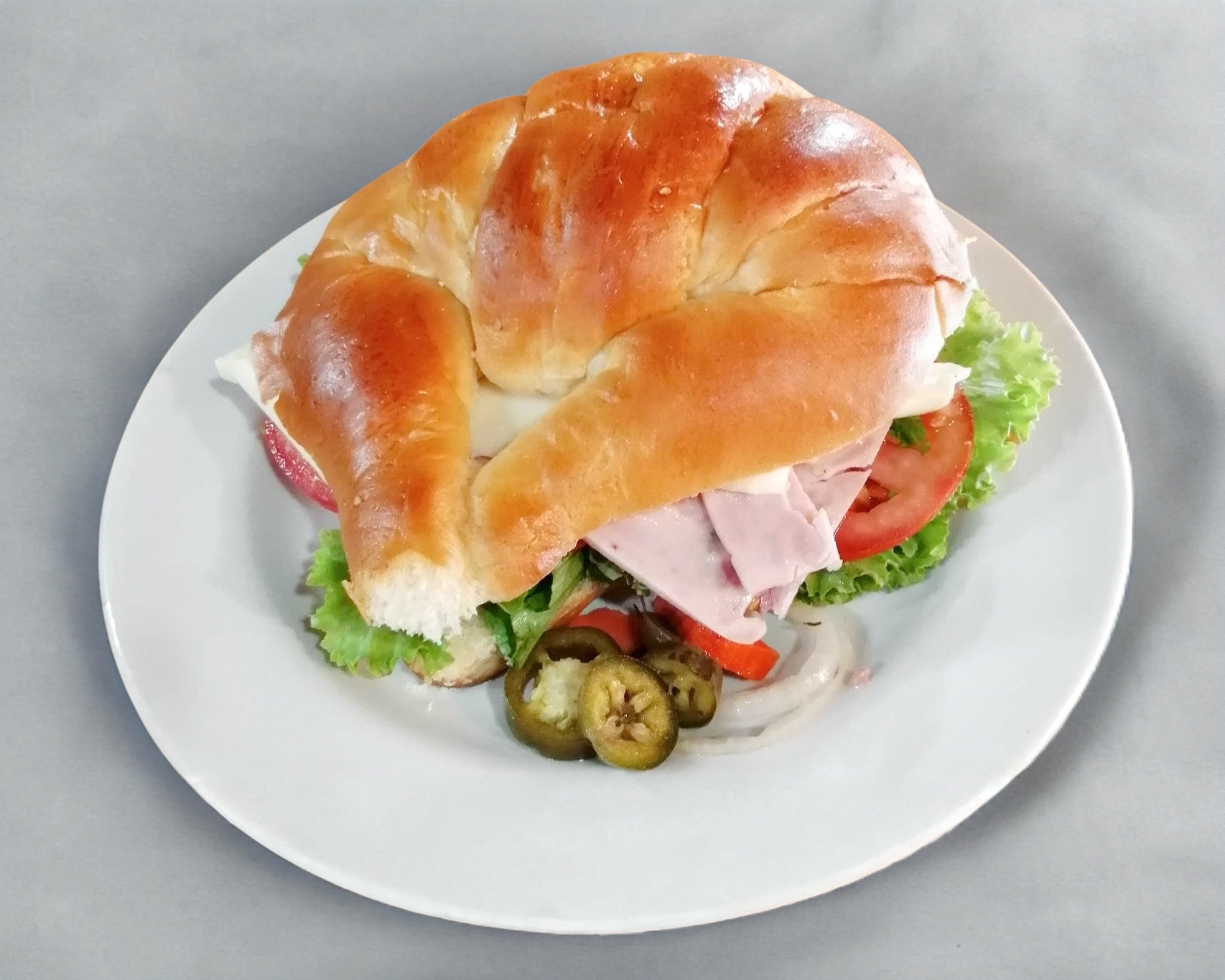 Jamón, queso, lechuga italiana, jitomate y aguacate, mayonesa y mostaza.