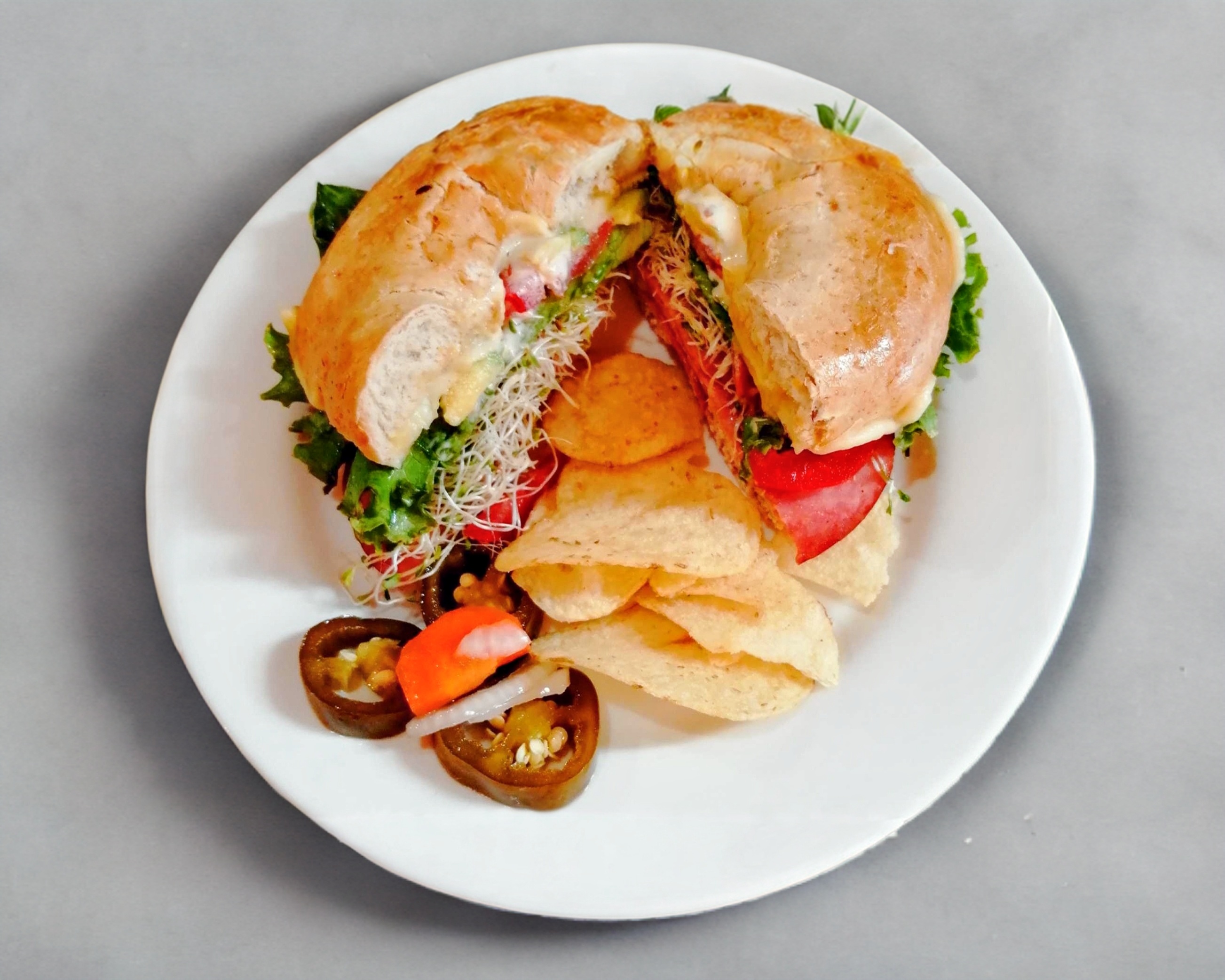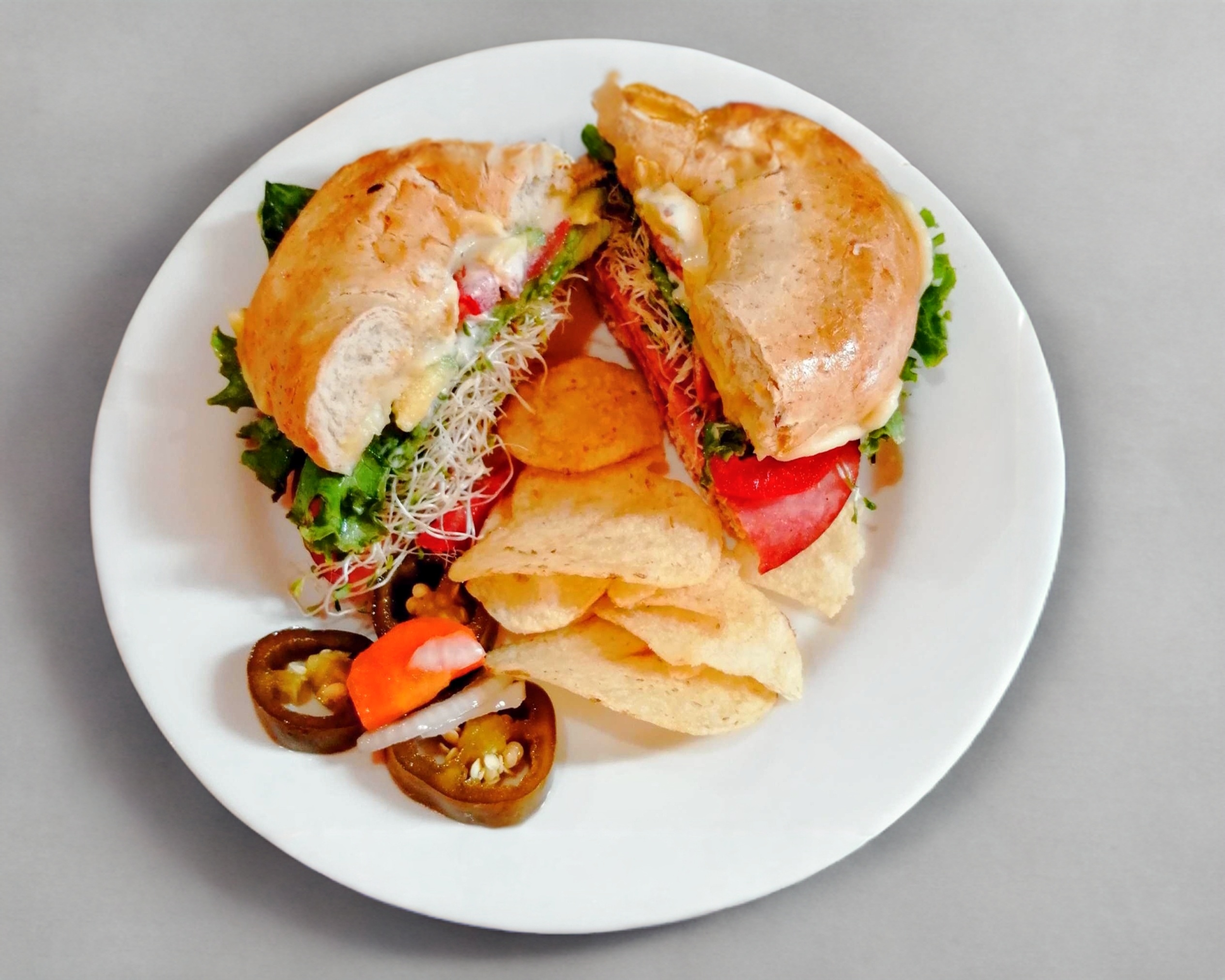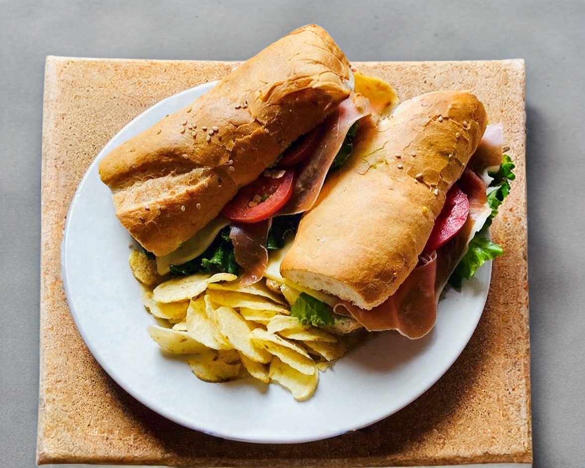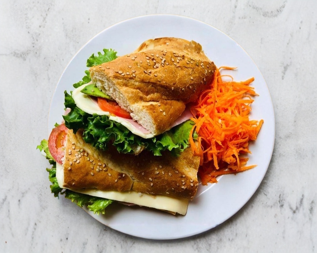 Jamón, queso, lechuga italiana, germen de alfalfa, pepino, jitomate y aguacate, mayonesa y mostaza.