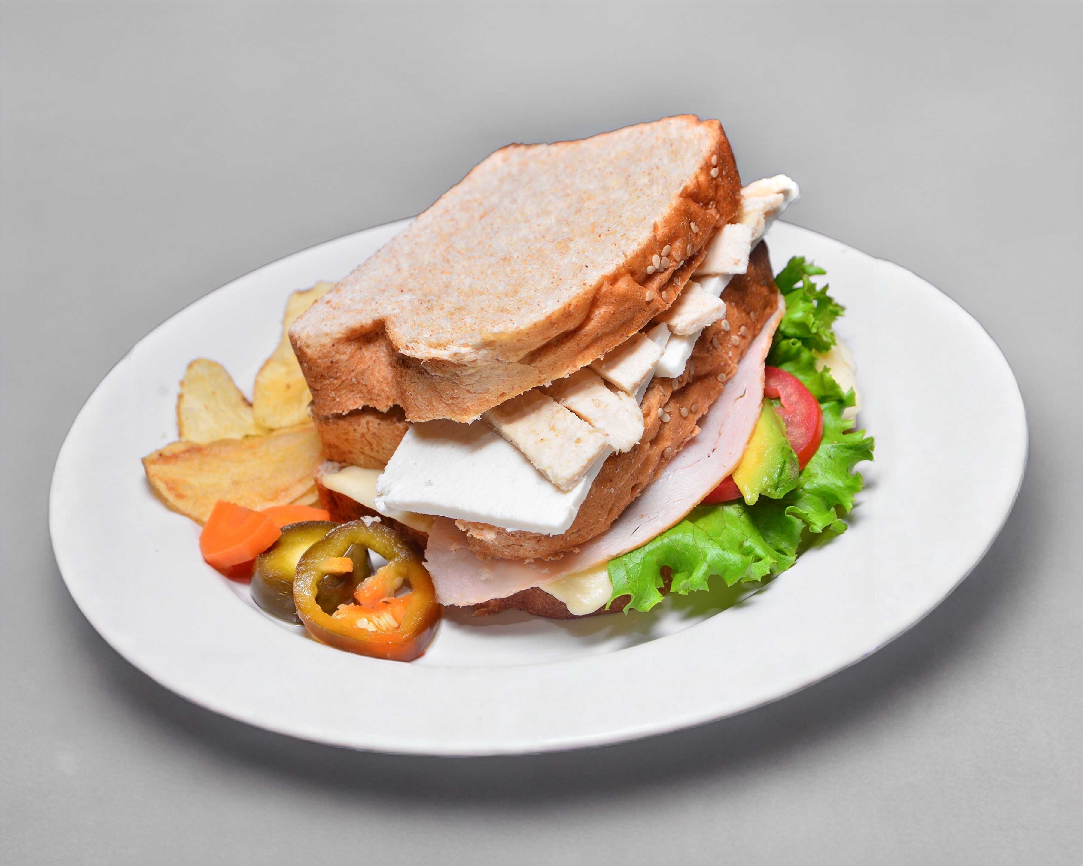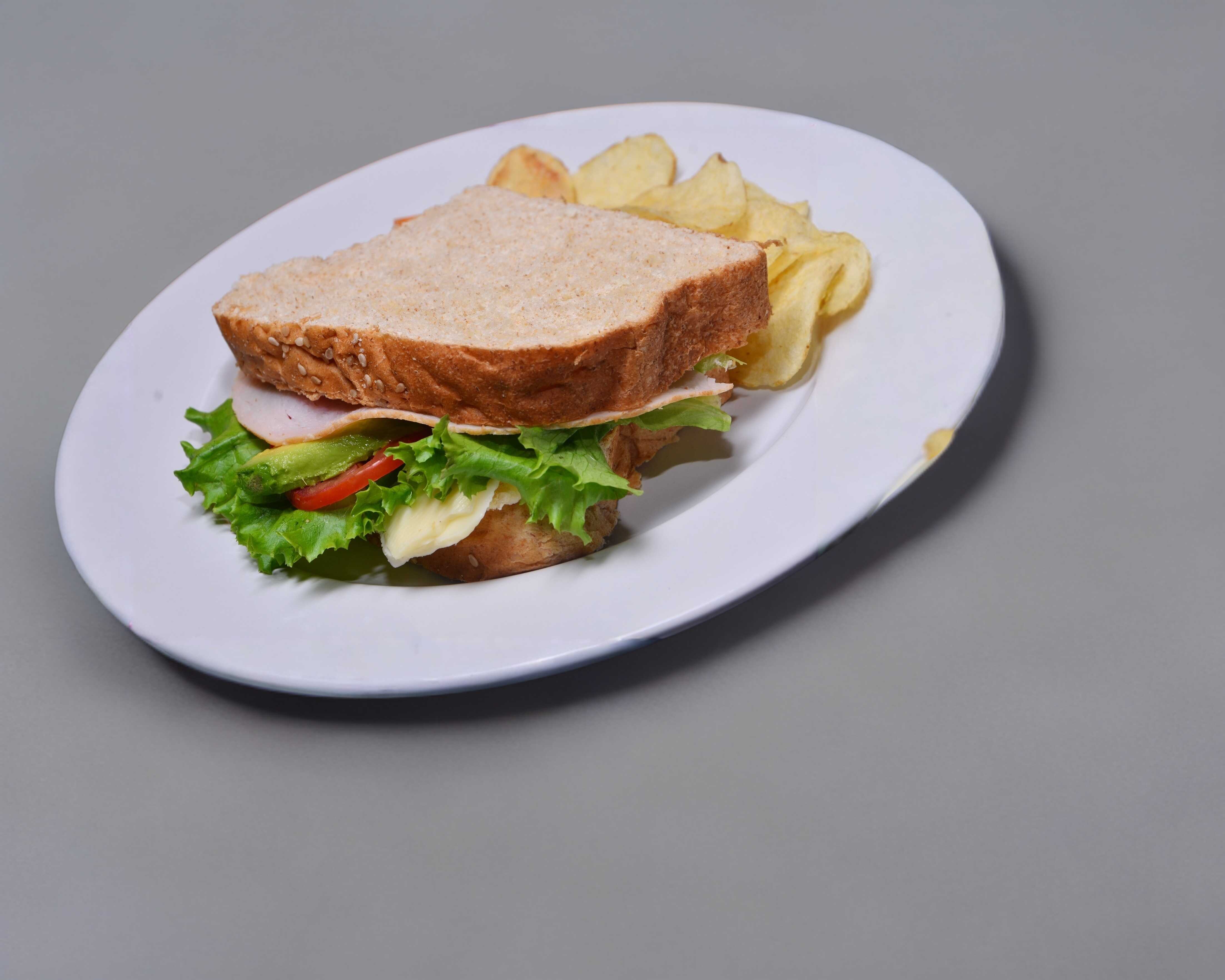 Pechuga de Pavo, queso manchego, lechuga italiana, jitomate y aguacate, mayonesa y mostaza.