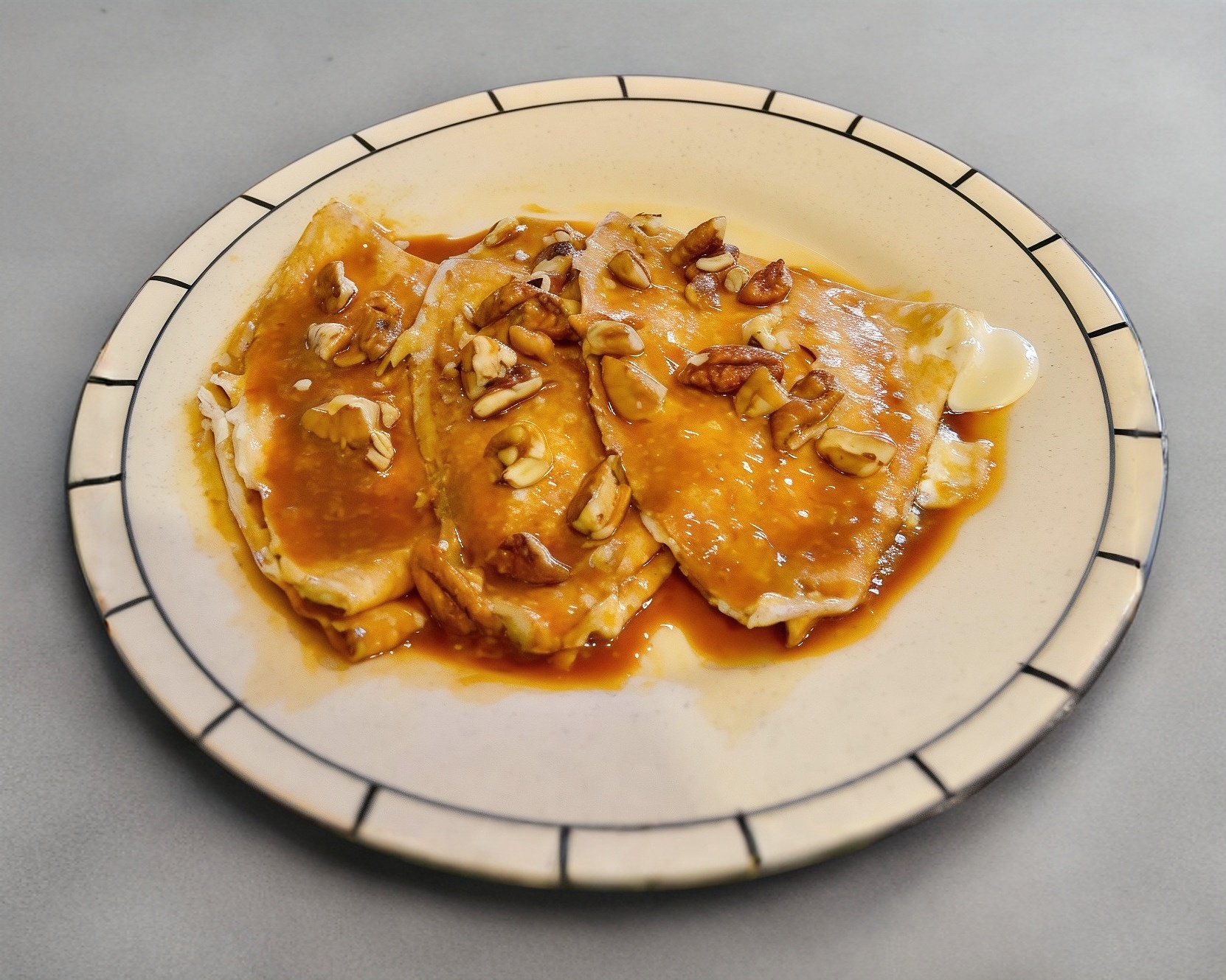 Crepas rellenas de queso crema bañadas con la mermelada de tu elección y nuez.