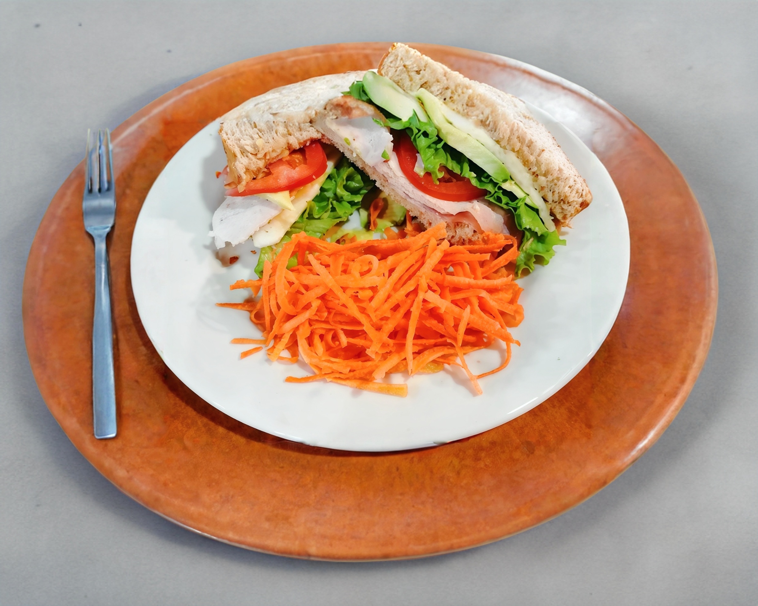 Pechuga de pavo, queso, lechuga italiana, germen de alfalfa, pepino, jitomate y aguacate, mayonesa y mostaza.