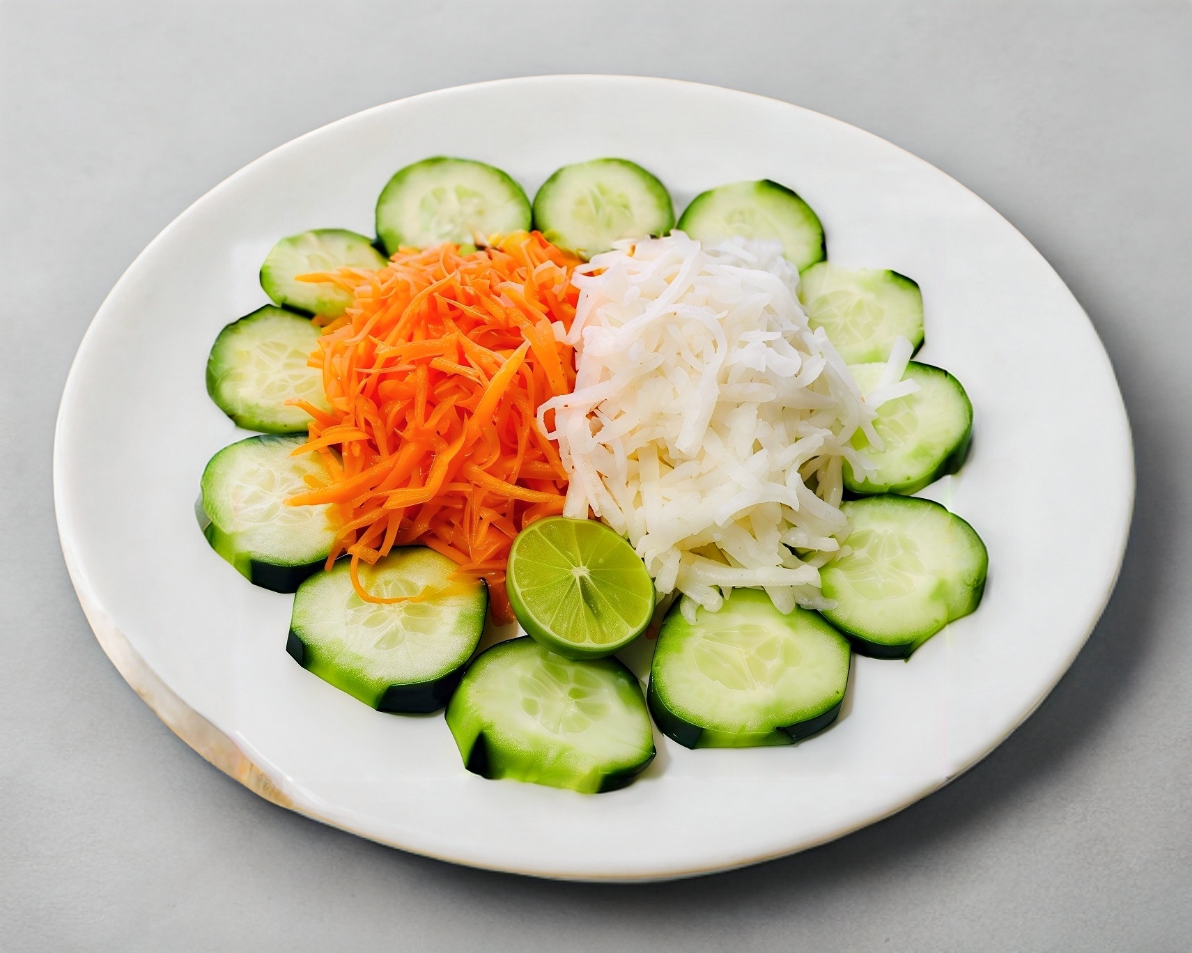Rodajas de Pepino acompañadas con Jícama y Zanahoria rayada. Incluye limón, sal y chile piquín