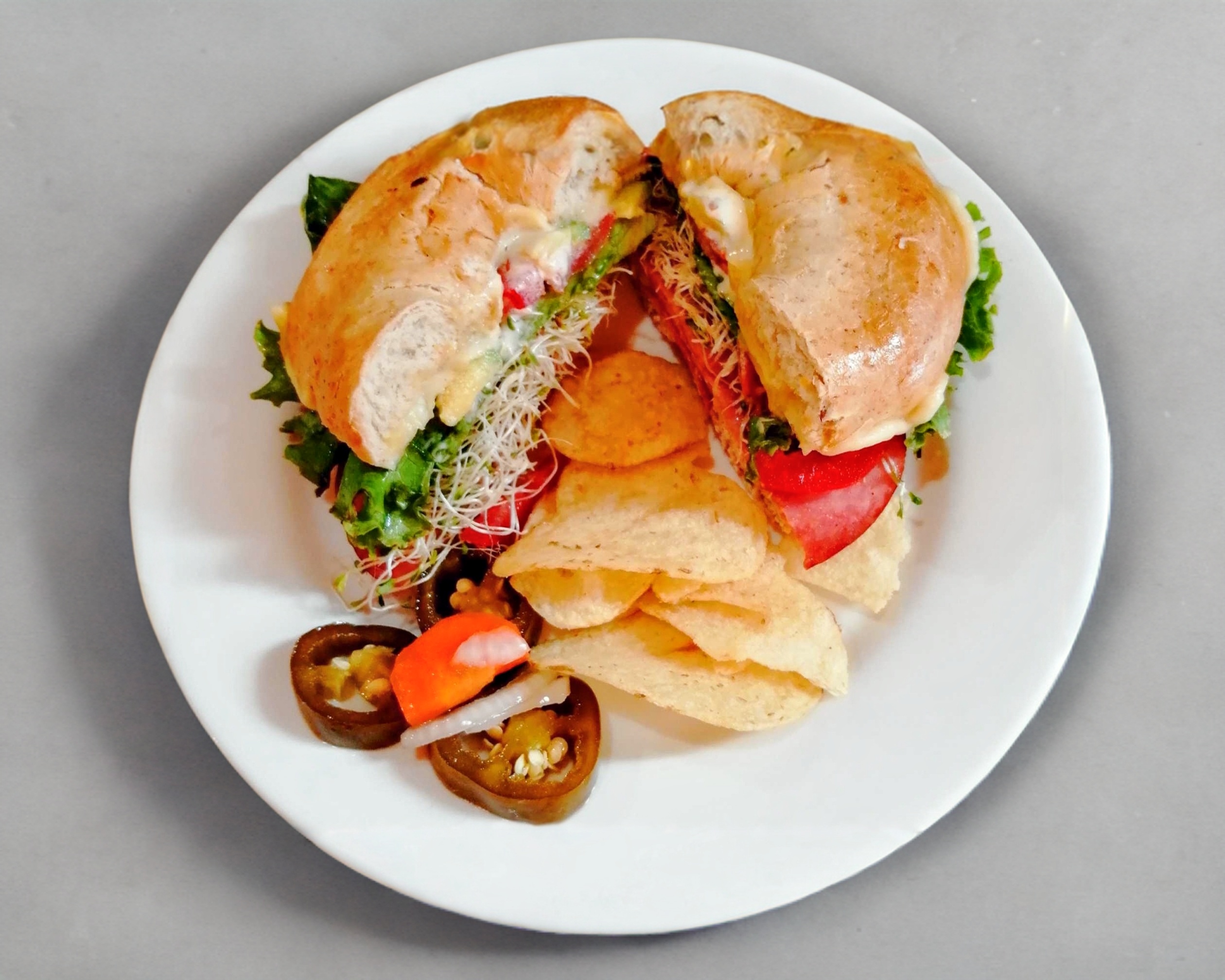 Queso, lechuga italiana, germen de alfalfa, pepino, jitomate y aguacate, mayonesa y mostaza.