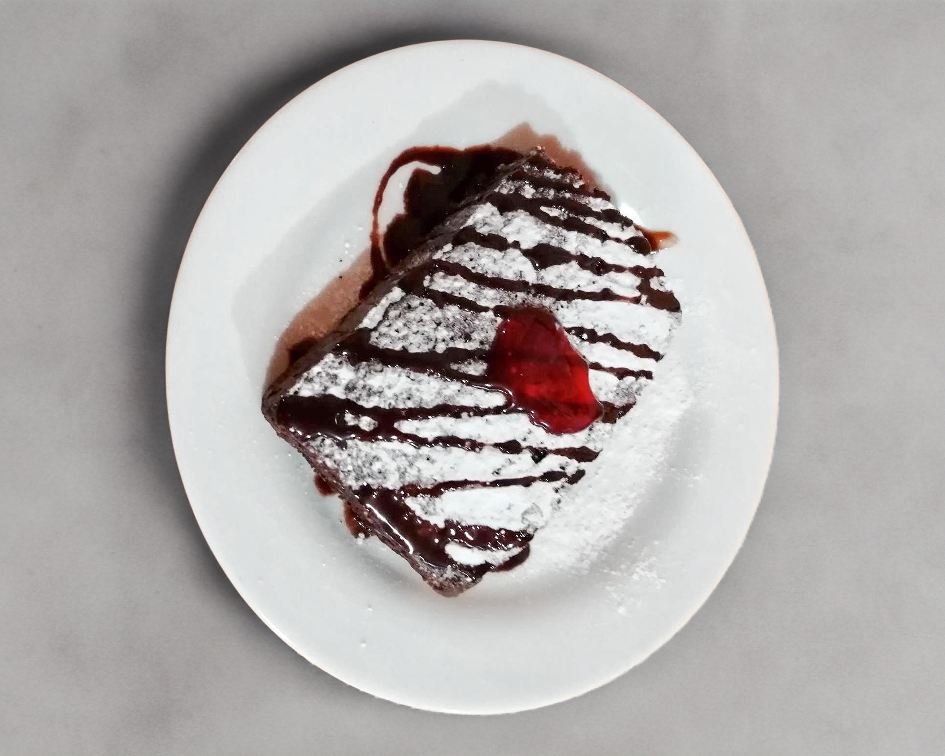 Delicioso brownie de chocolate preparado con azúcar glass y salsa de chocolate.
