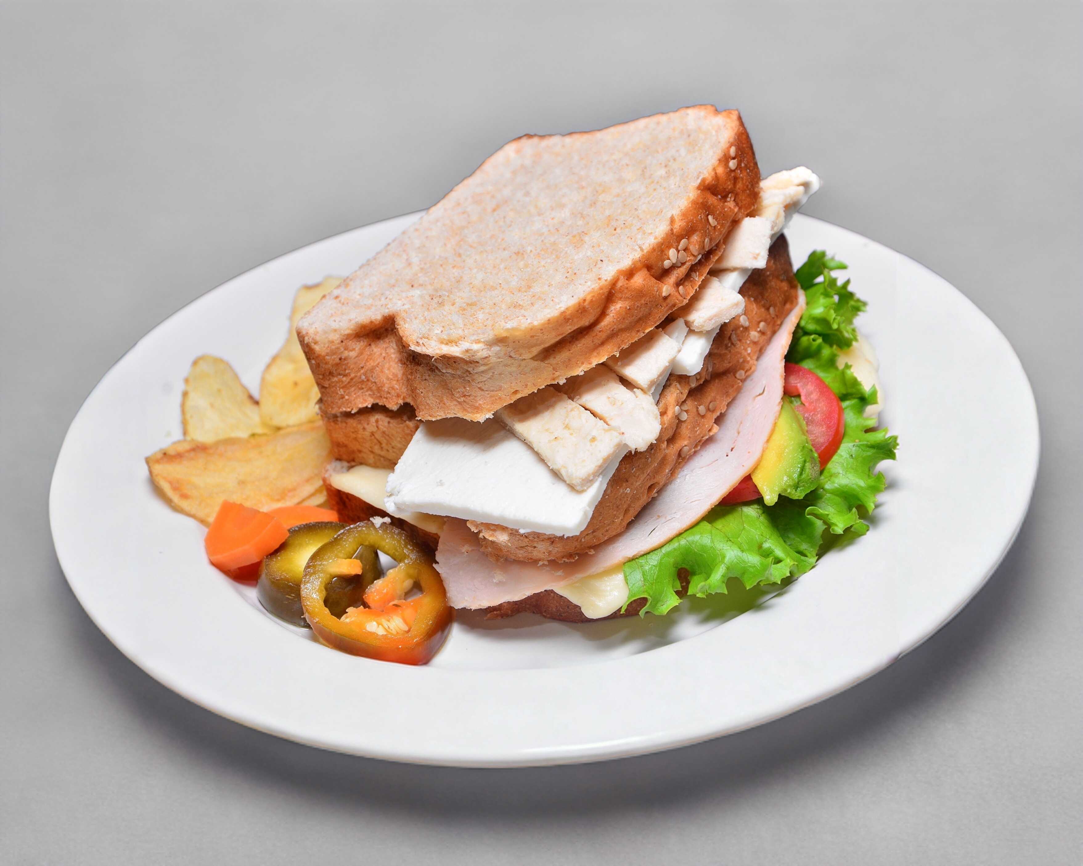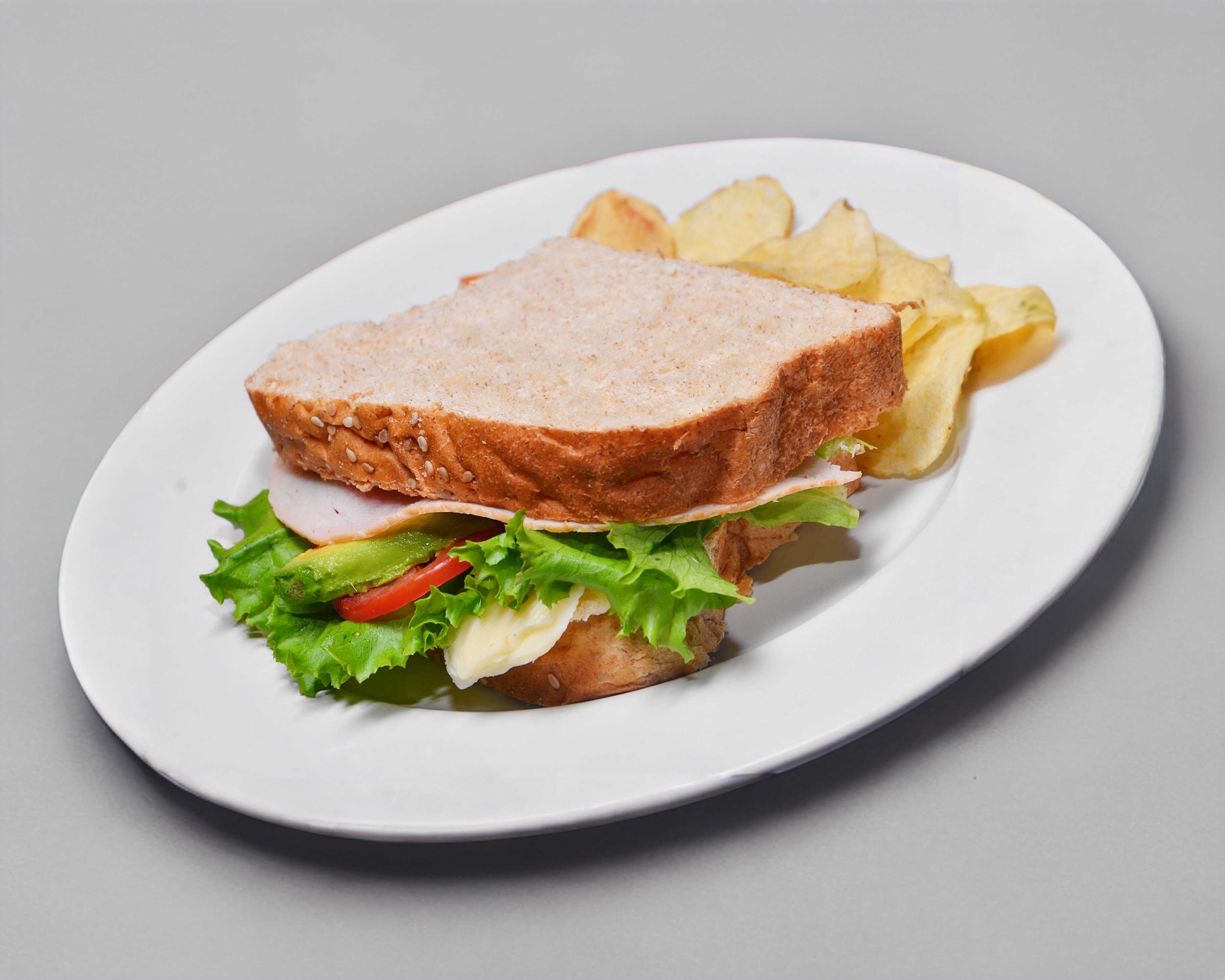 Pechuga de pavo, queso, lechuga italiana, jitomate y aguacate, mayonesa y mostaza.