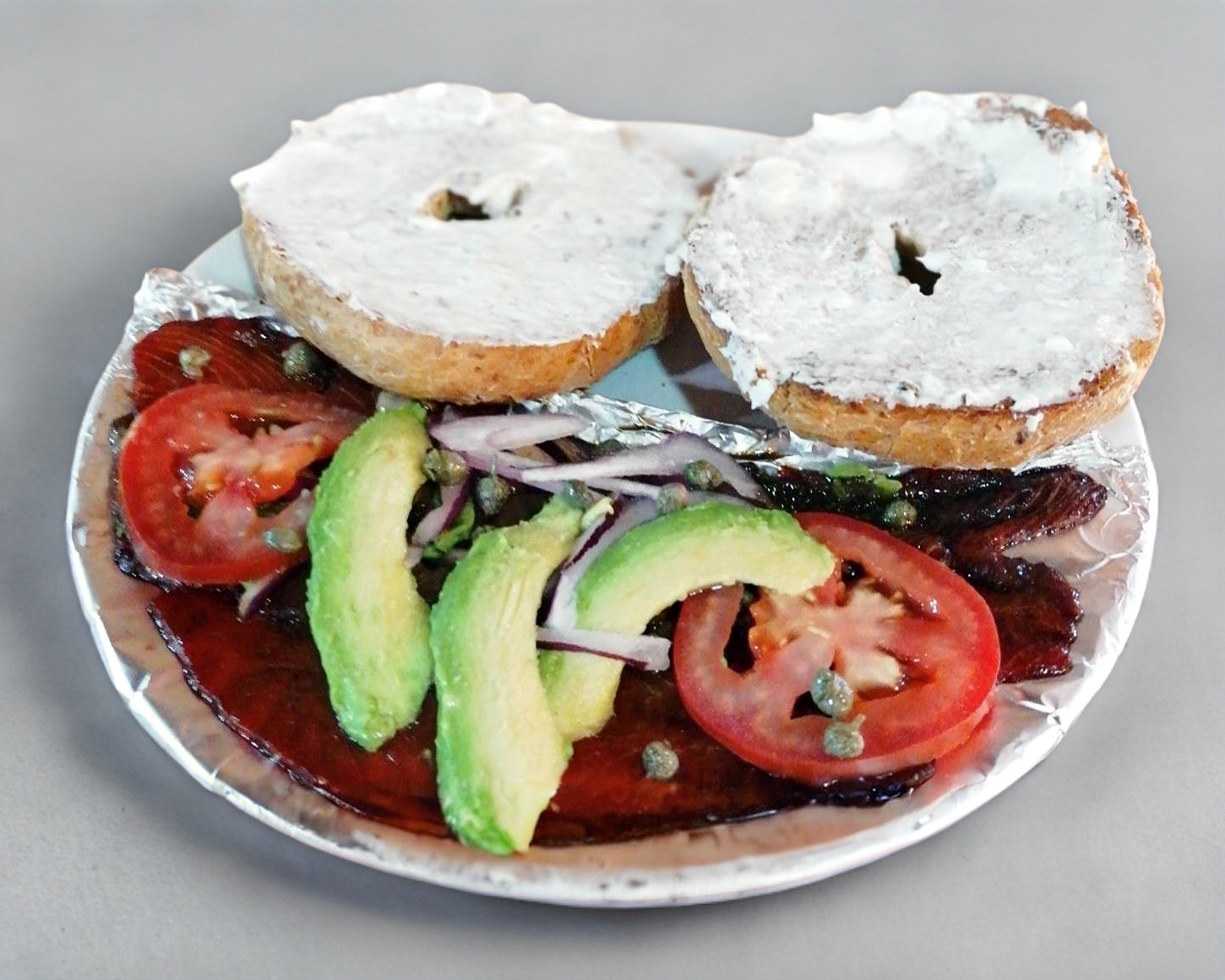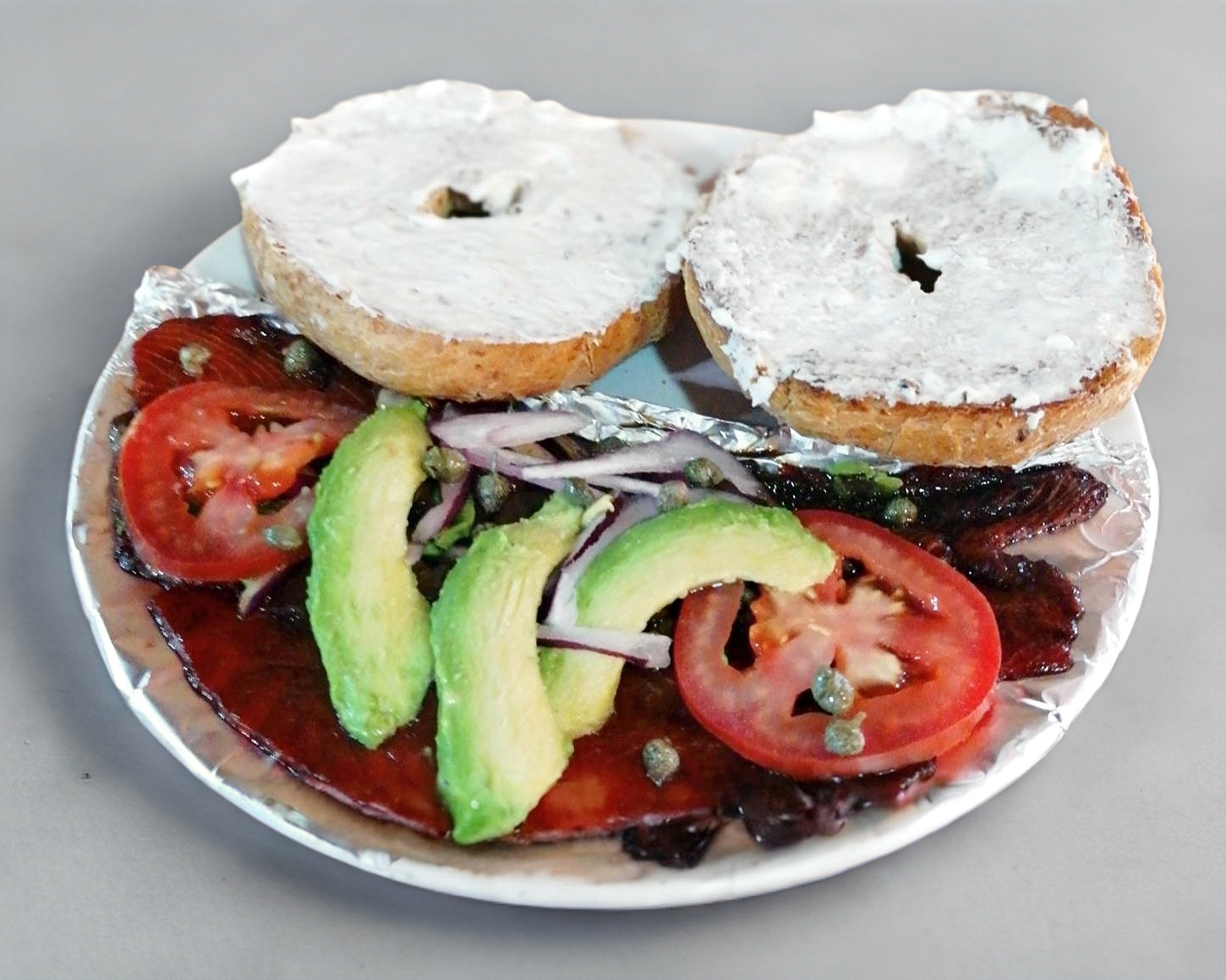 Bagel integral con queso crema acompañado de salmón aderezado con jugo maggi y salsa inglesa, queso crema, alcaparras, cebolla morada, jitomate y aguacate