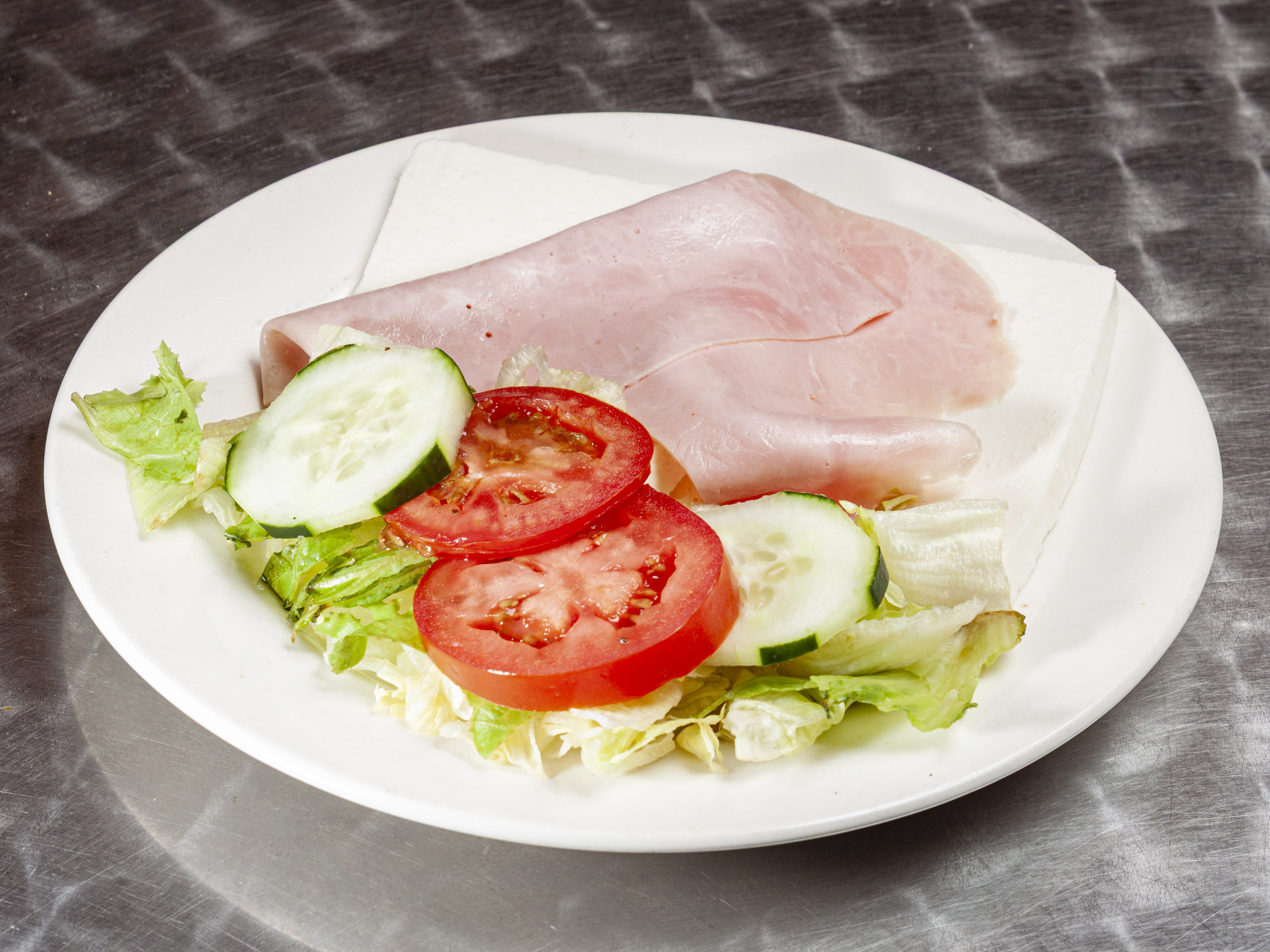 Combinación de lechuga romana e italiana con cubos de pechuga de pavo, jamón, queso panela, manchego, amarillo , parmesano, aceitunas, jitomate y aguacate.
