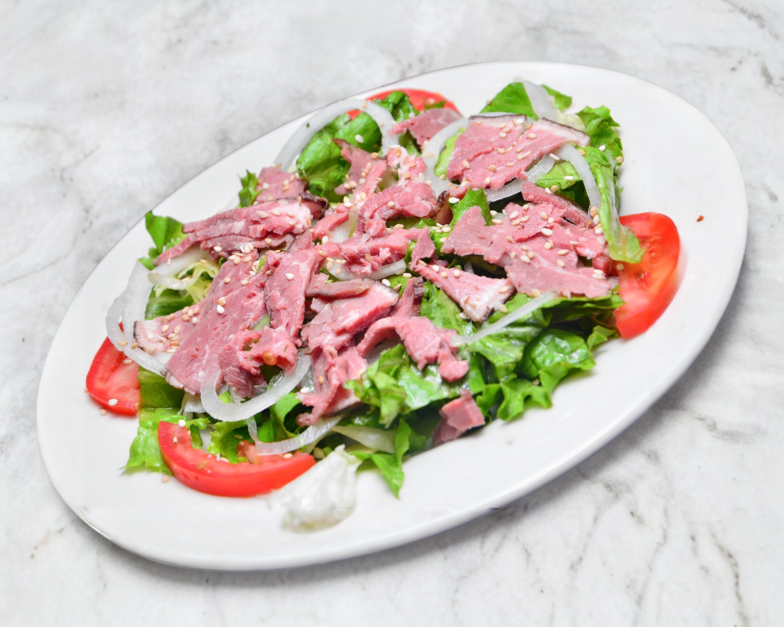 Combinación de lechuga romana e italiana con roast beef, jitomate, cebolla, ajonjolí, aderezo italiano y aceite de oliva.
