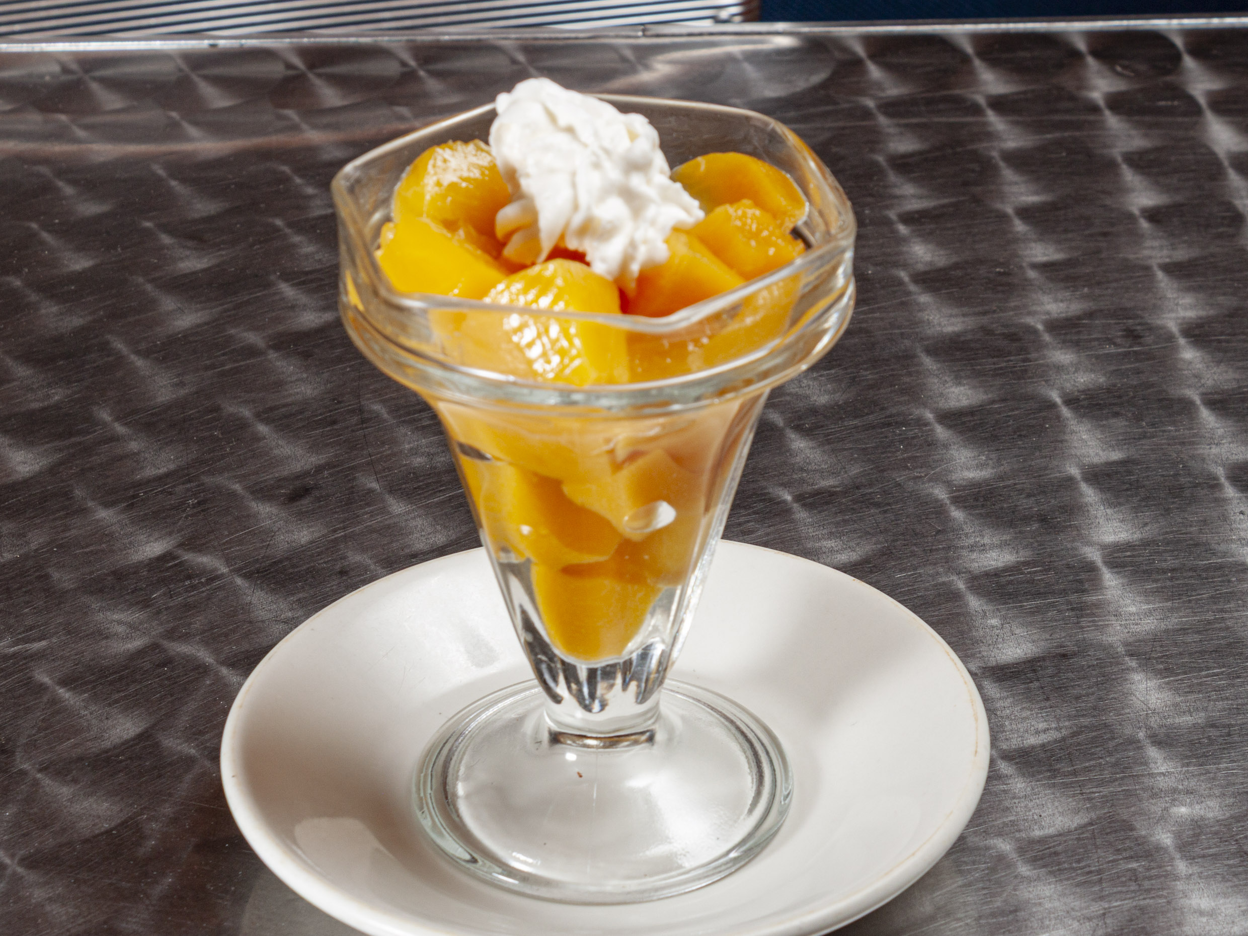 Cubos de duraznos en almíbar con crema de la casa acompañado con chispas de chocolate.