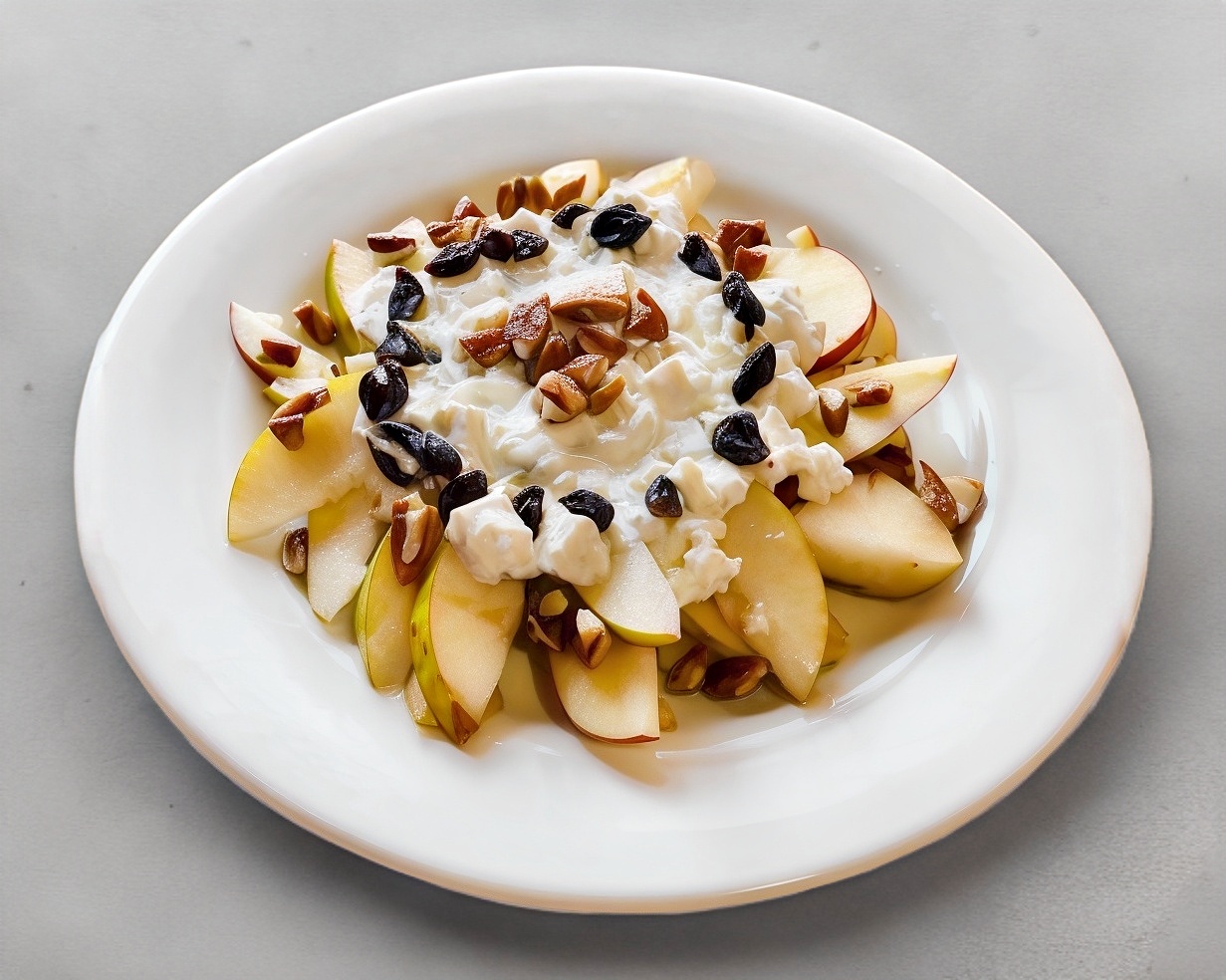 Láminas de manzana y pera bañadas con queso cottage, nuez y pasas.
