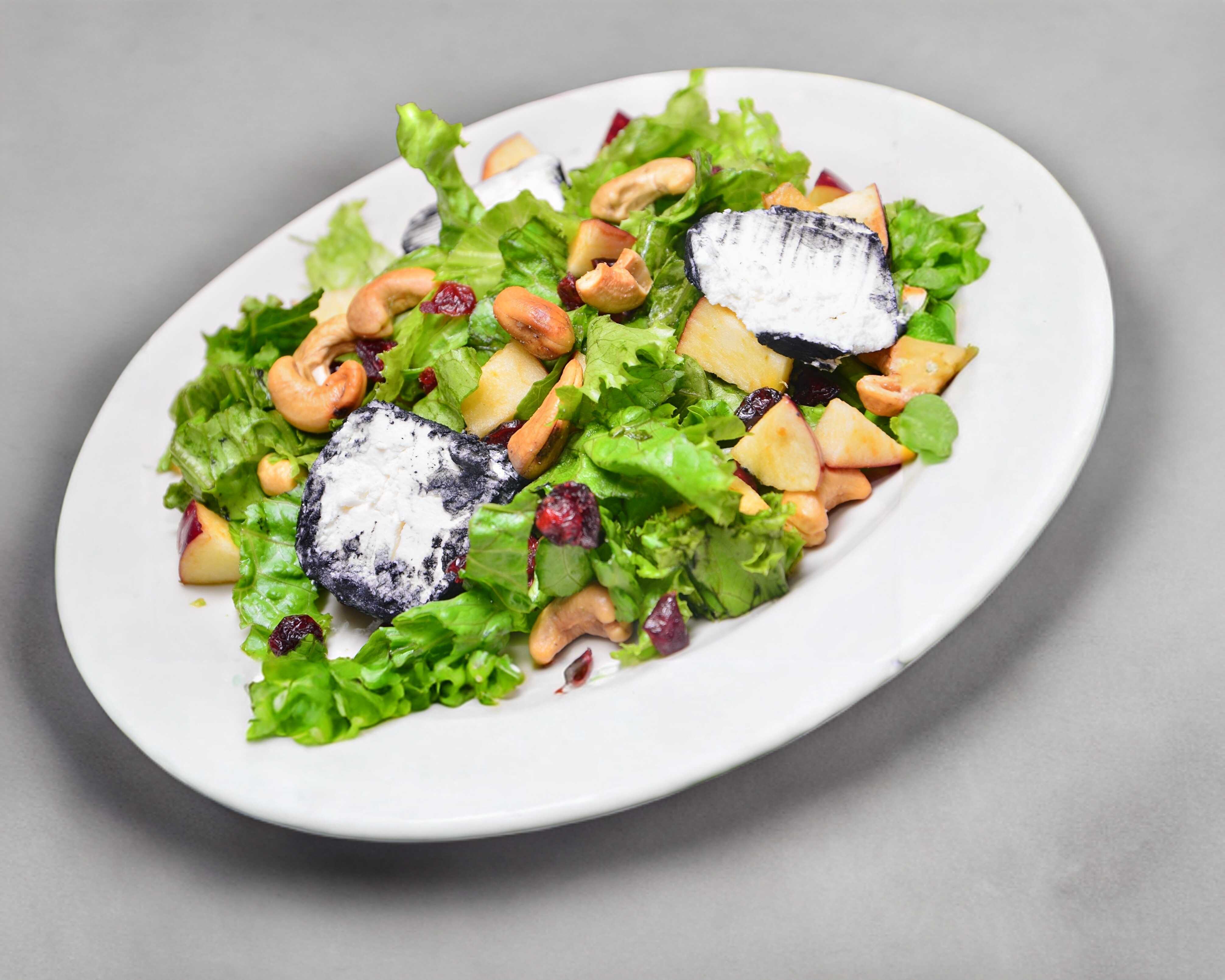 Hojas de lechuga italiana acompañadas con manzana, arándanos, nuez, queso de cabra y aderezo mostaza miel.