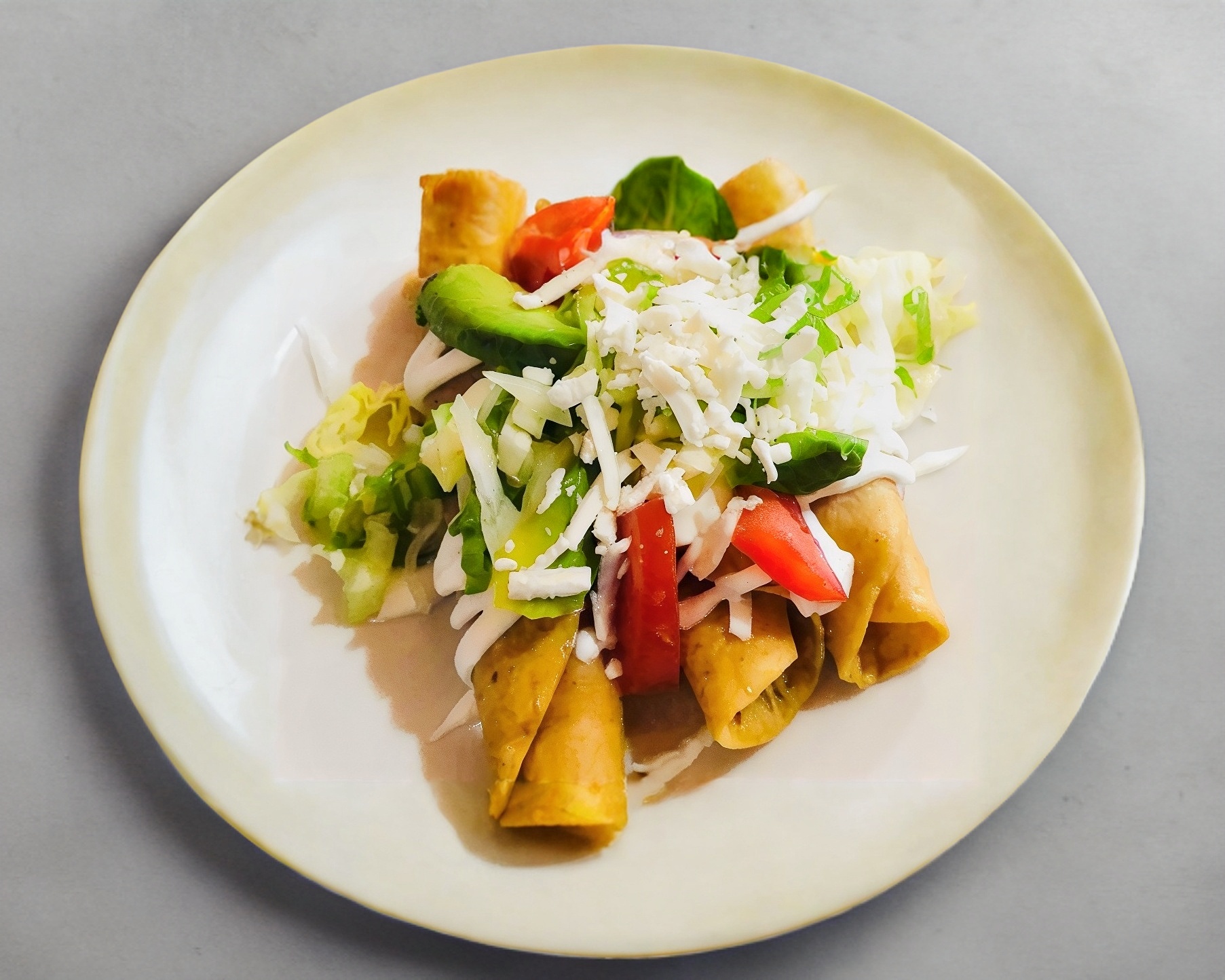 Tacos dorados de tortillas de maíz cubiertos con lechuga, crema, queso rayado, jitomate y aguacate.