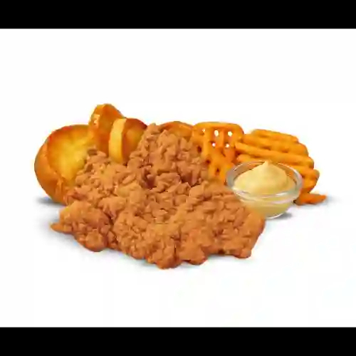 Crujientes, doradas y listas para sumergirse.tiras de pollo frito (120 g) acompañadas con tres aderezos a elegir.