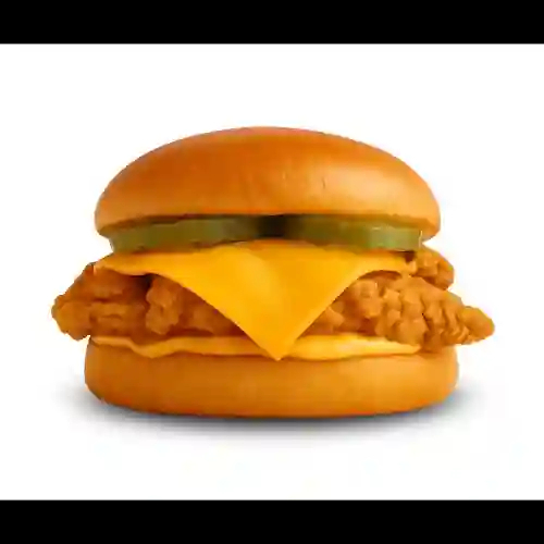 Una mordida y todo hace click. Pollo frito (90 g), queso cheddar (15 g), pepinillos y aderezo.