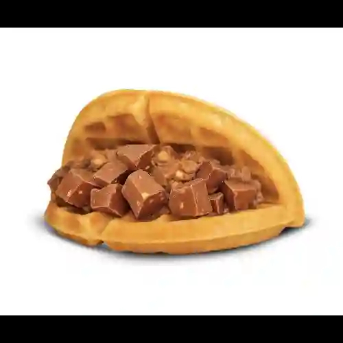 Sándwich de waffle, relleno de dulce chocolate, crocantes y avellana, espolvoreado con cocoa.