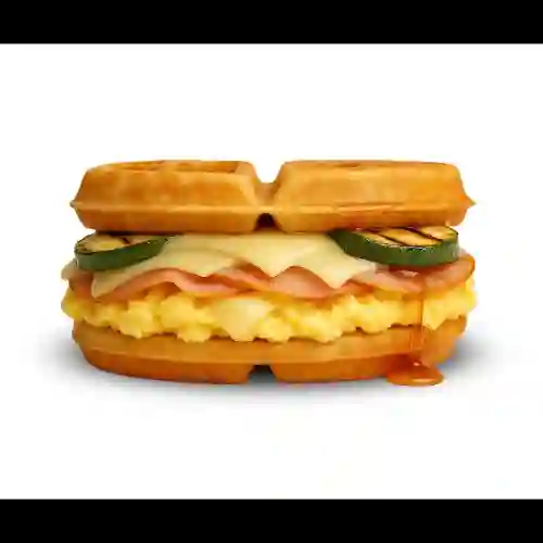 Sándwich, de waffle con un mix de jamón de pavo ahumado, horneado con miel, queso manchego, calabacitas al grill, huevo revuelto.