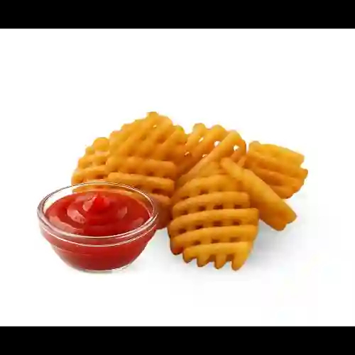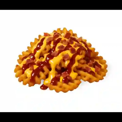 Papas wafle, bañadas en salsa de queso cheddar, BBQ y trocitos de tocino frito.