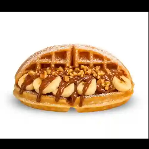 Sándwich de waffle con plátano, jarabe de nutella y nuez espolvoreado con azúcar glass.