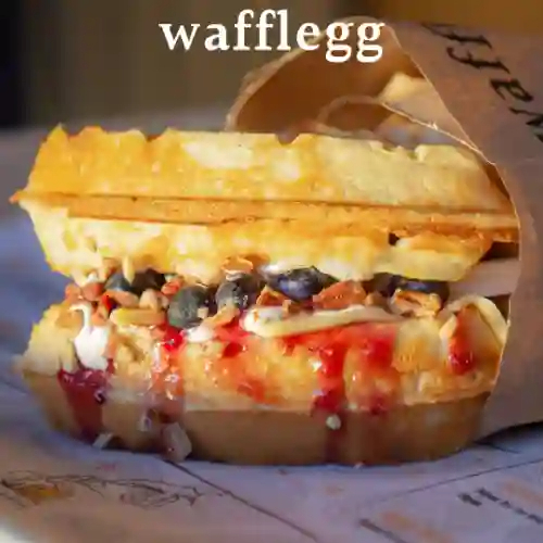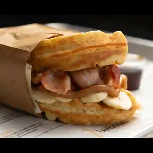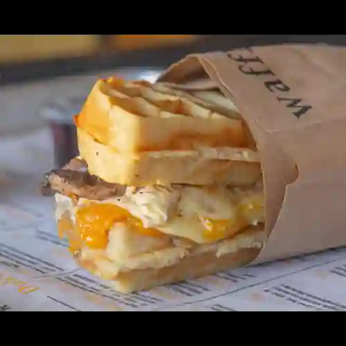 Sándwich waffle relleno de pollo frito (receta original), huevo, salsa de queso cheddar y tocino.