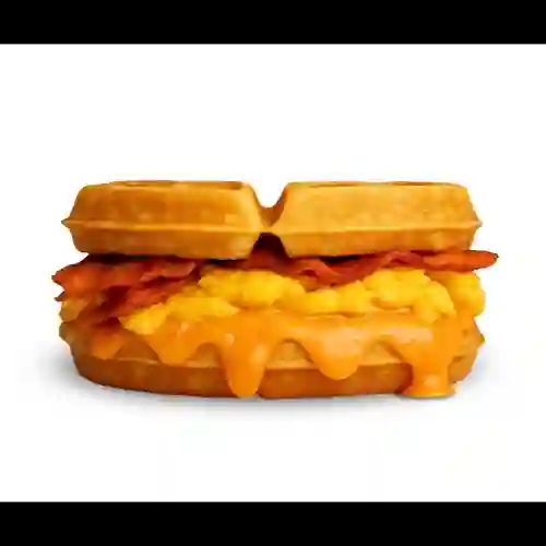 1/2 Waffle, tocino crujiente, huevo revuelto y queso americano.