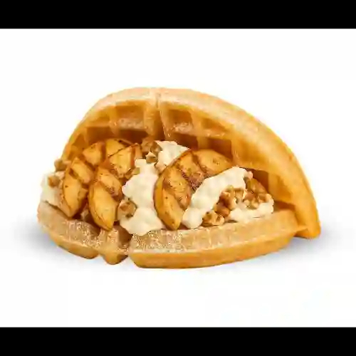 Sándwich de waffle con manzana al grill, syrup de canela, nuez y queso mascarpone, espolvoreado con azúcar glass y acompañado con dip de la casa.