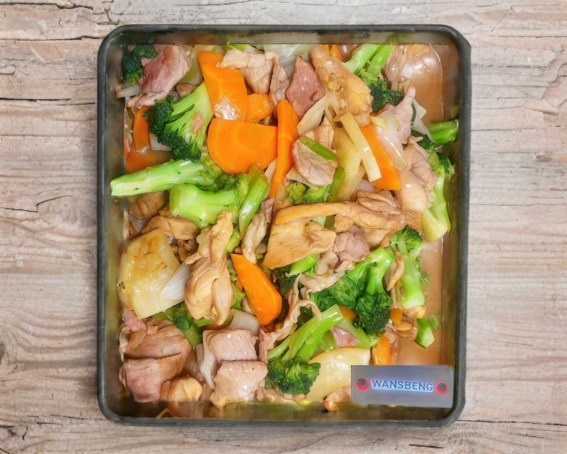 Lleva carne de pollo ,cerdo y verduras en charola chica