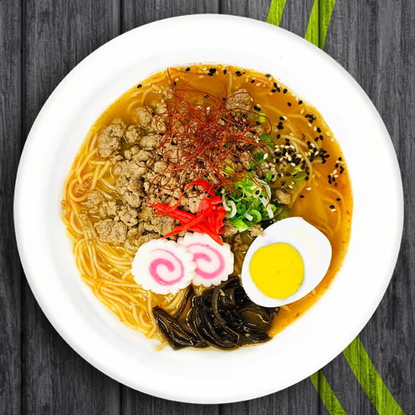 Fondo tare miso picante, acompañado de carne sazonada estilo Tokio, hilos de chile, Beni shoga, kikurage, cebollín y huevo estilo osen