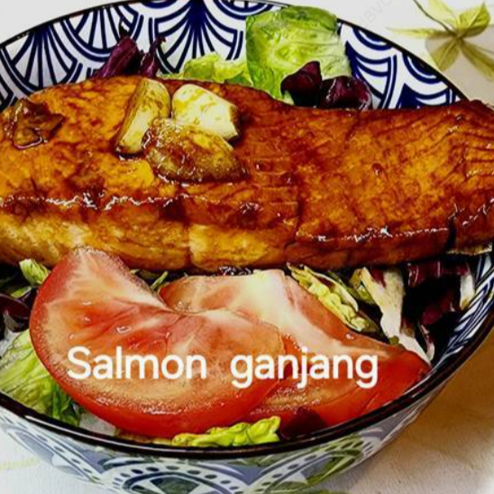 Salmón, salsa de soya con jengibre, ajo (puede pedir sin ajo), azucar, vinagre, lechuga, arroz. Salmon, ganjang sauce with ginger, garlic (you can order without the garlic), vinegar, ginger, sugar, lettuce, rice.