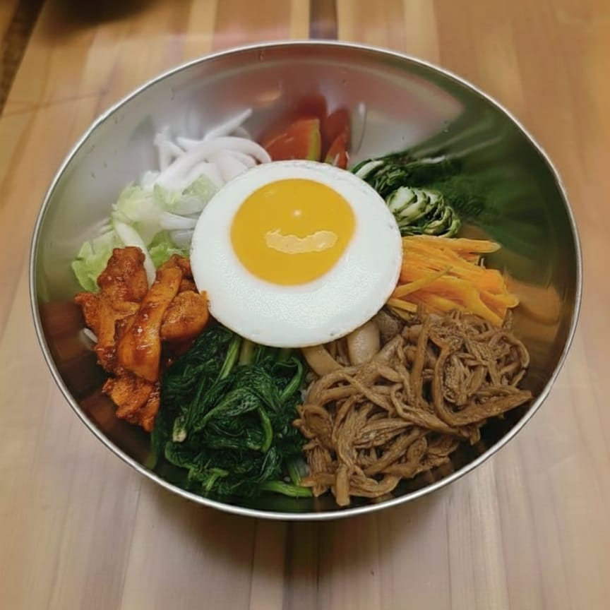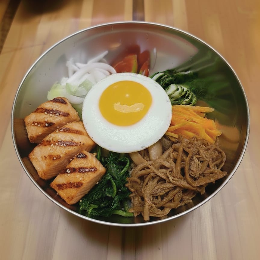 Bibimbap con filete de salmón asado, verduras frescas y salsa de gochujang ligera. Una versión moderna y saludable. Ingredientes:Arroz, salmón, calabacín, zanahoria, espinaca, gochujang, aceite de sésamo, huevo. Nota culinaria: Ideal para quienes buscan una opción nutritiva y equilibrada con proteína de alta calidad.