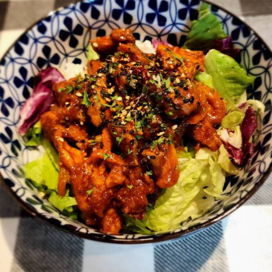 Un delicioso bibimbap hecho con dakgalbi: pollo marinado en salsa coreana picante y salteado con verduras frescas. El pollo tierno y ligeramente picante, combinado con arroz caliente y verduras crujientes, crea un plato equilibrado y aromático. Ingredientes: Arroz, pollo marinado en salsa dakgalbi, calabacín, zanahorias, pepinos, champiñones, lechuga, pimientos, cebolla roja, salsa gochujang