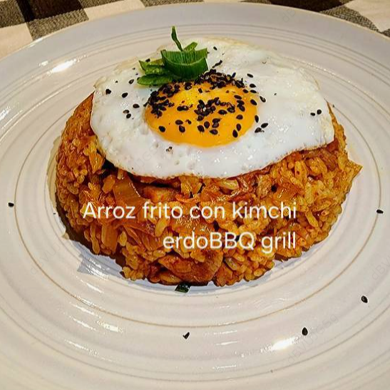 Arroz al vapor, kimchi, cebolla blanca, cabeza de lomo BBQ grill, huevo frito. Kimchi fried rice, pork loin bbk grill, huevo frito.