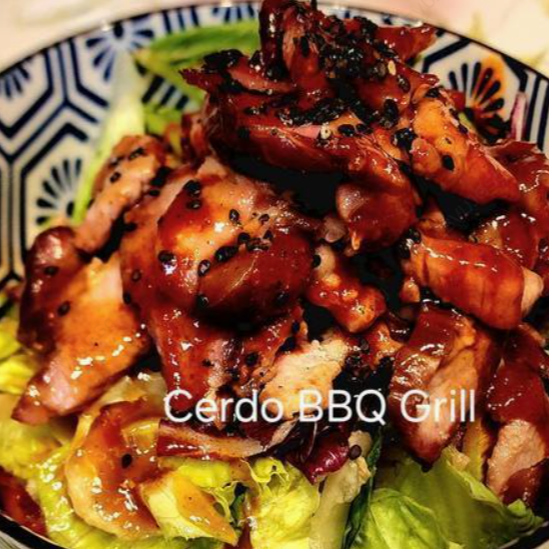 Lomo de cerdo BBQ grill, lechuga, arroz, salsa de soya y chile (puede pedir sin salsa de chile) pork loin BBQ grill, with soy sauce & chili sauce (you can order it with out the chili sauce).