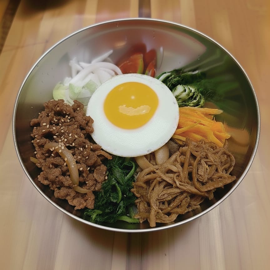 Arroz con carne de res bulgogi marinada en salsa dulce de soya y verduras. Se sirve con huevo frito y gochujang. Ingredientes: Arroz, carne de res, salsa de soya, ajo, azúcar, cebolla, aceite de sésamo, gochujang, verduras. Nota culinaria: El bibimbap más popular fuera de Corea, conocido por su equilibrio perfecto de sabores dulces y salados.