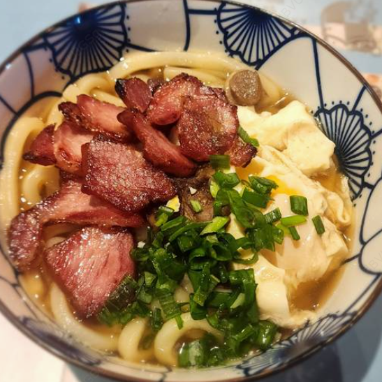 Fideo de udon, lomo de cerdo BBQ grill, salsa de la soya de la casa, shitake, huevo, cebolla cambray. Udon noodles, soy sauce, shitake, huevo, pork loin BBQ grill, spring onion.