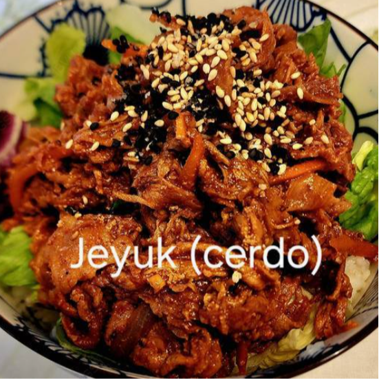 Cabeza de lomo con salsa de gochujang (chile) (un poco picante y dulce), zanahoria, cebolla blanca, cebolla cambray, lechuga, arroz, pork loin with gochujang (chili sauce) (it is little sweet & spicy), carrot, onion, cabbage, spring onion, lettce, rice.