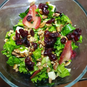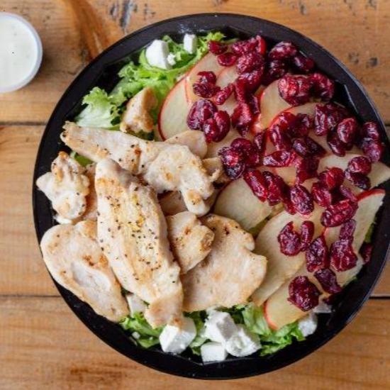 Lechuga, manzana, arándanos, queso fresco y pollo.