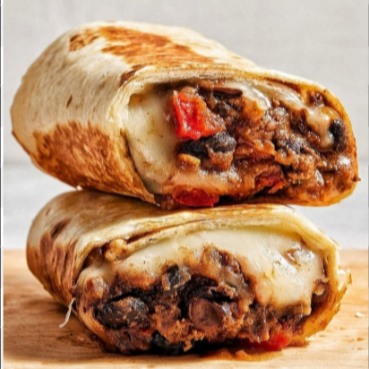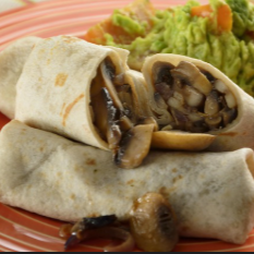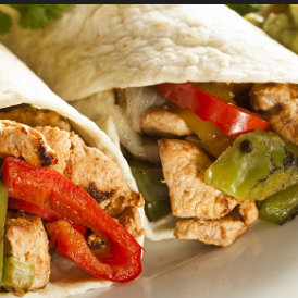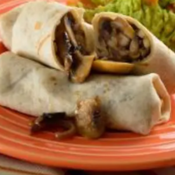 Pollo, champiñones, pimiento rojo, pimiento verde, queso, frijoles y tortilla de harina.