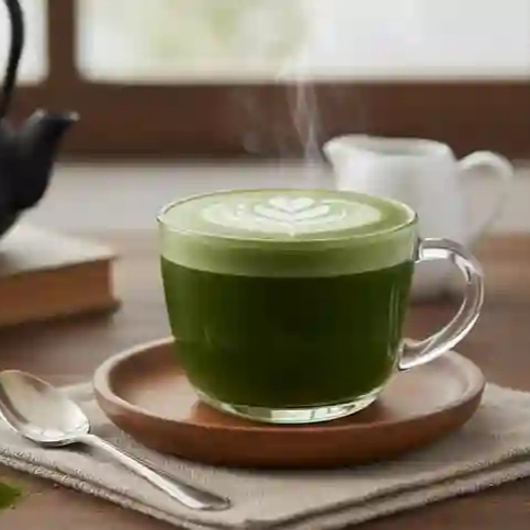 Té verde japonés con leche vaporizada, sabor terroso y energizante.