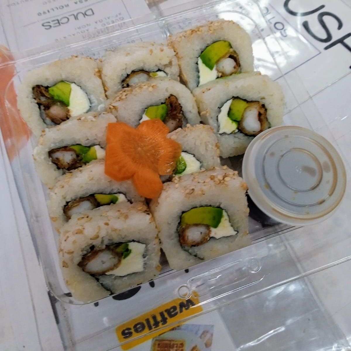 Rollos de sushi, relleno de queso , aguacate y camarón empanizado, por fuera ajonjolí . ( Cada rollo 10 bocados) .