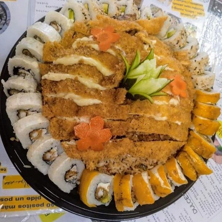 3 rollos ( California, banana y Philadelphia) yakimeshi yasai, carne y toriquesos.