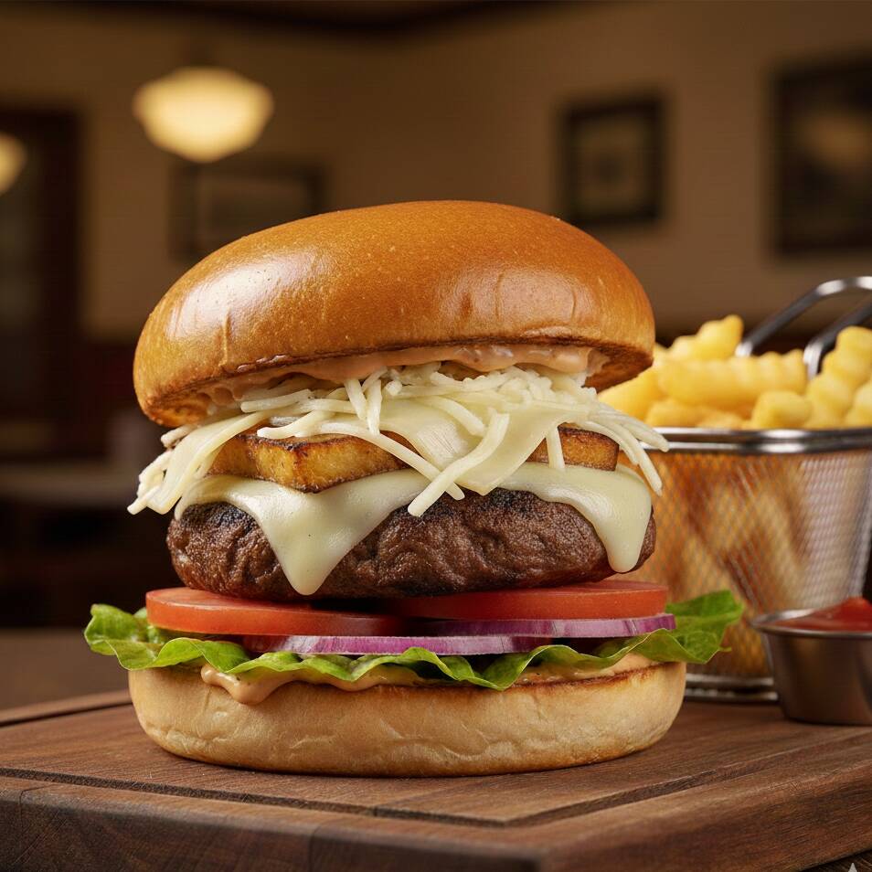 hamburguesa clasica cn extra de queso ,gouda oaxaca manchego y orden de papas