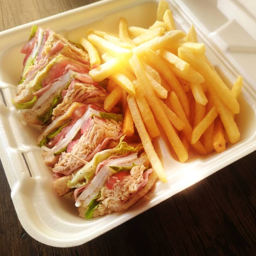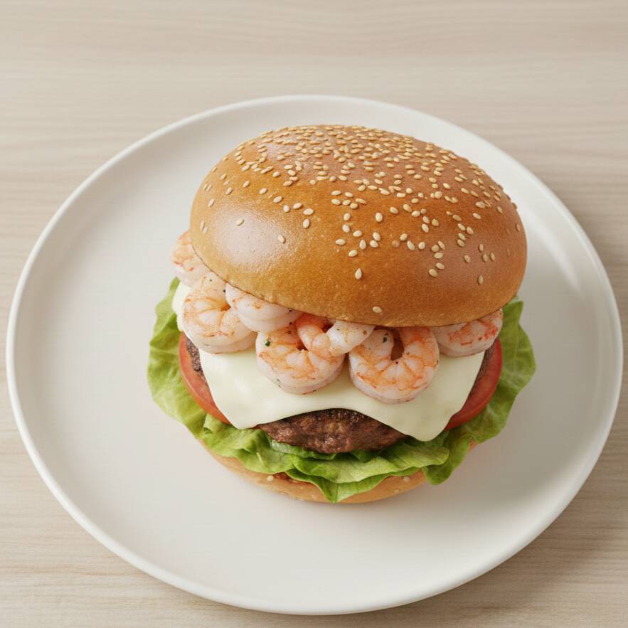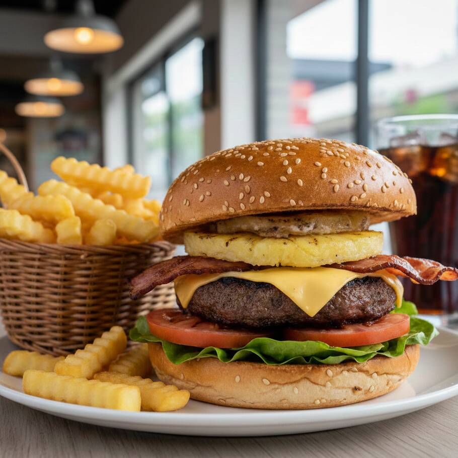 Hamburguesa con piña , jamón , queso gratinado y papas