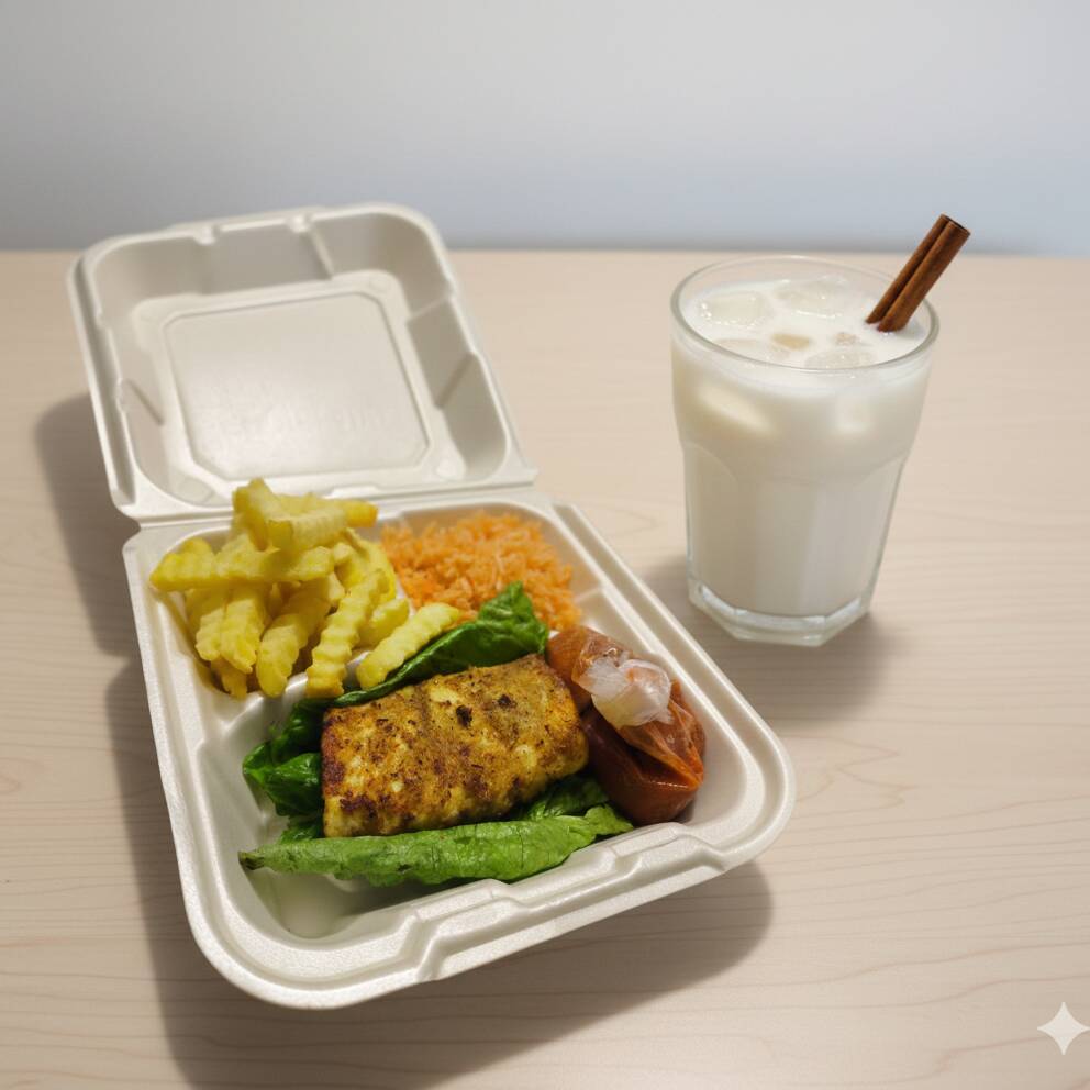 Filete de pescado empanizado acompañado de arroz, ensalada fresca o papas fritas