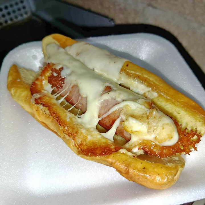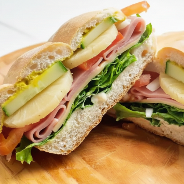 torta de jamon con queso, tocino, lechuga, mayonesa y piña