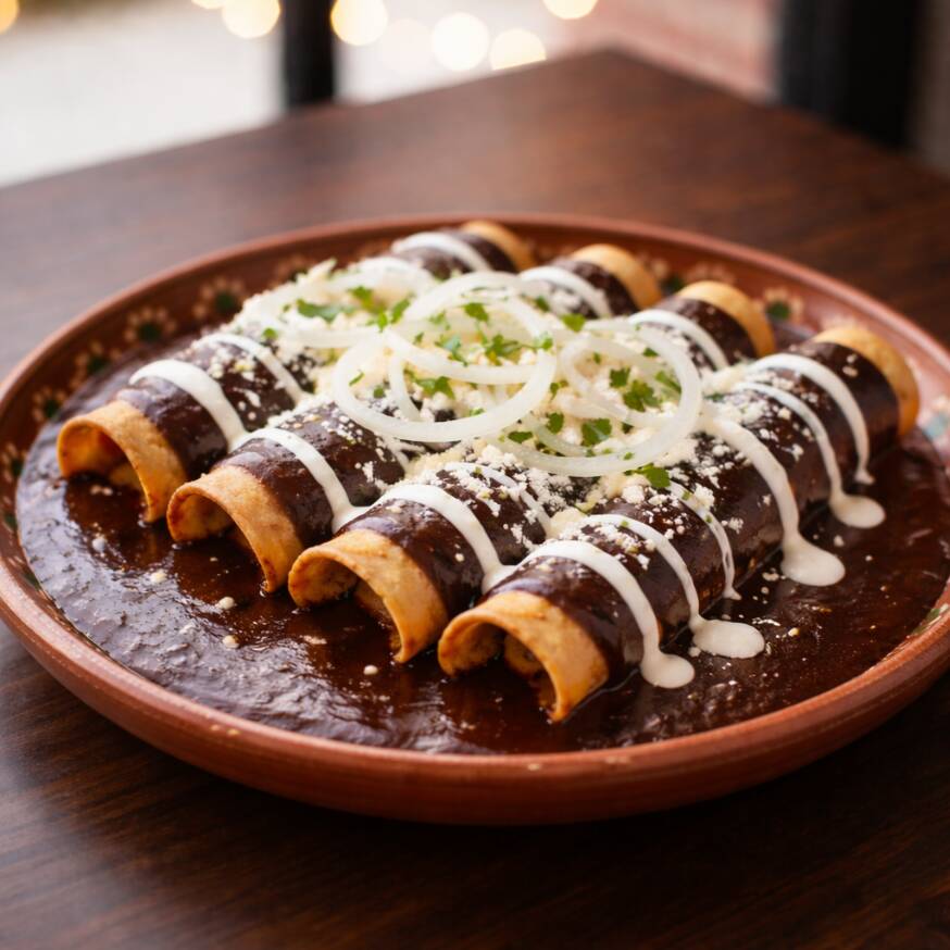 Cuatro enmoladas con cebolla, queso, crema y mole casero